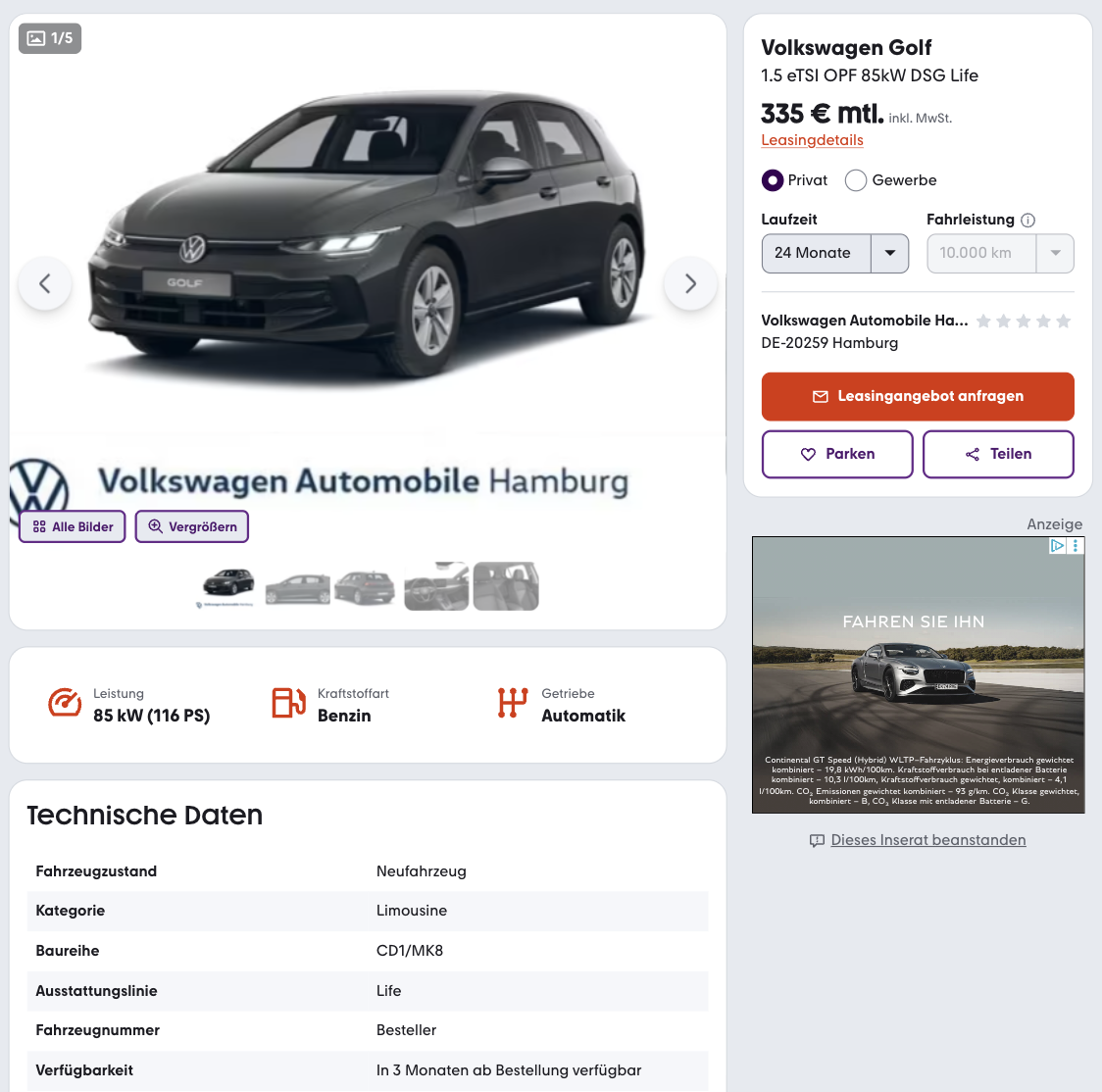 Es gibt Autos, die müssen nichts beweisen, weil sie den Alltag seit Jahren leise dominieren. Genau so ein Typ ist der Golf, vertraut im Handling, kompakt im Format, aber erwachsen im Auftritt. Den VW Golf 1.5 eTSI OPF 85 kW DSG Life könnt ihr bei mobile.de für 335 Euro brutto im Monat leasen. Es ist eine Bestellaktion, also frei konfigurierbar, von der Lackierung bis zu den Ausstattungspaketen, damit am Ende nicht irgendein Golf vor der Tür steht, sondern der passende.