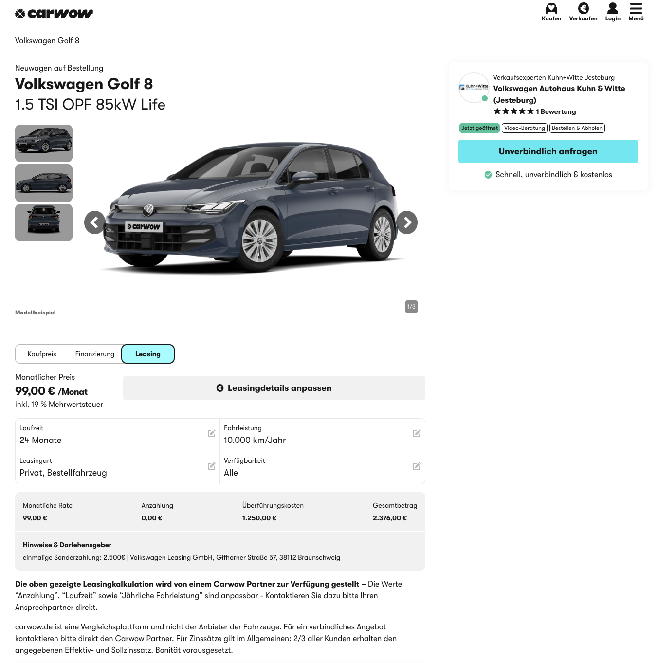 VW Golf als gĂĽnstiger Einstieg in die Kompaktklasse! Bei carwow gibt es den VW Golf 1.5 TSI OPF 85 kW Life fĂĽr 99 Euro brutto pro Monat, berechnet mit einer Sonderzahlung von 2.500 Euro. Wer die Sonderzahlung in die Monatsrate einrechnet, landet bei einer normalisierten Leasingrate von 203,17 Euro brutto. Angeboten wird ein frei konfigurierbares Bestellfahrzeug, Ausstattung und Wunschfarbe lassen sich also noch selbst festlegen, statt ein festes Lagerauto ĂĽbernehmen zu mĂĽssen.