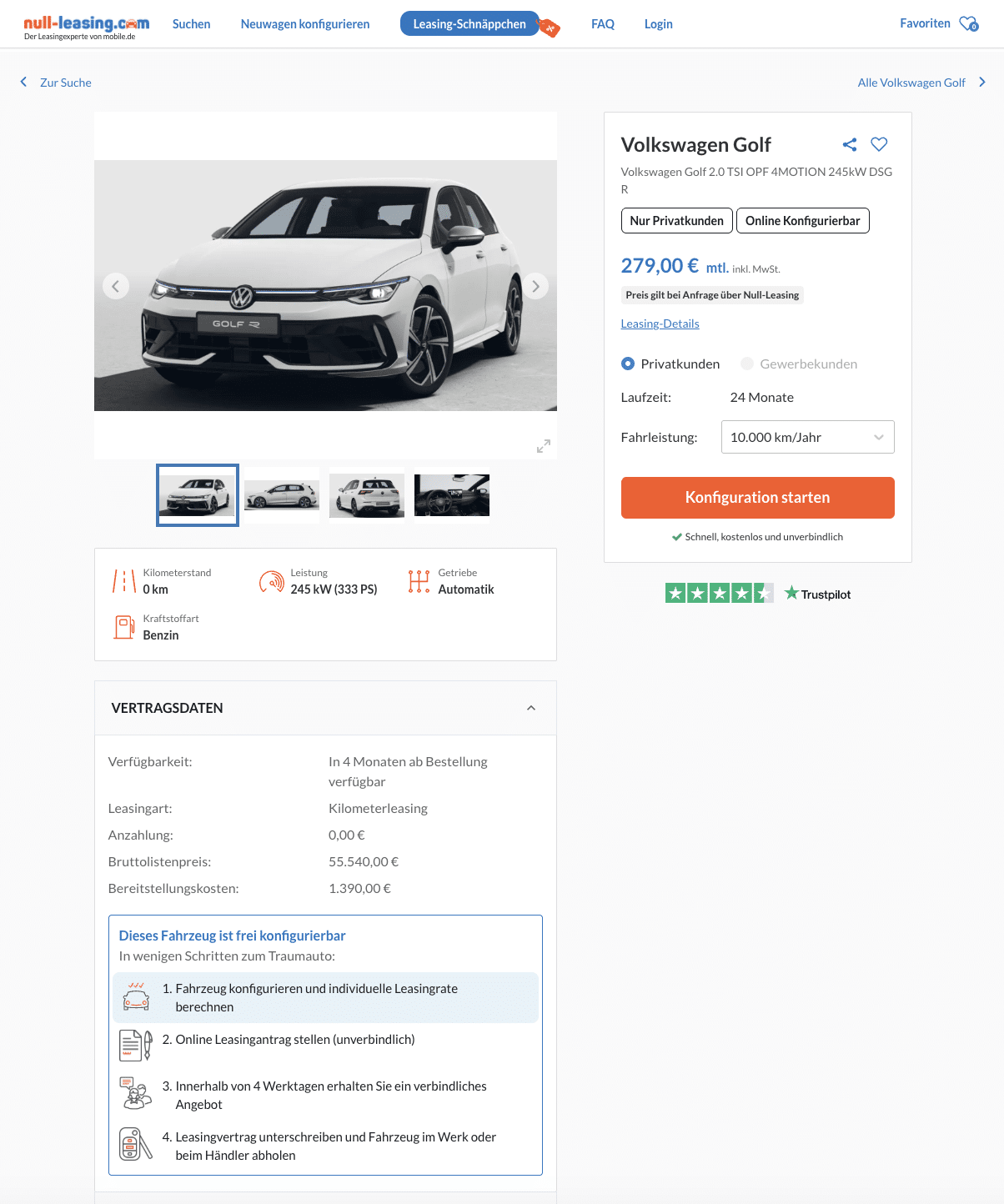 Wenn ein Golf ein R trägt, dann ist klar, hier wird geballert! Der VW Golf R 2.0 TSI OPF 4MOTION DSG ist mit seinen 333 PS das stärkste Serienmodell der Baureihe. Bei Null-Leasing gibt’s den Hot Hatch aktuell für schlanke 279 Euro brutto im Monat. Frei konfigurierbar, Lieferzeit rund fünf Monate, Leasingfaktor 0,50.