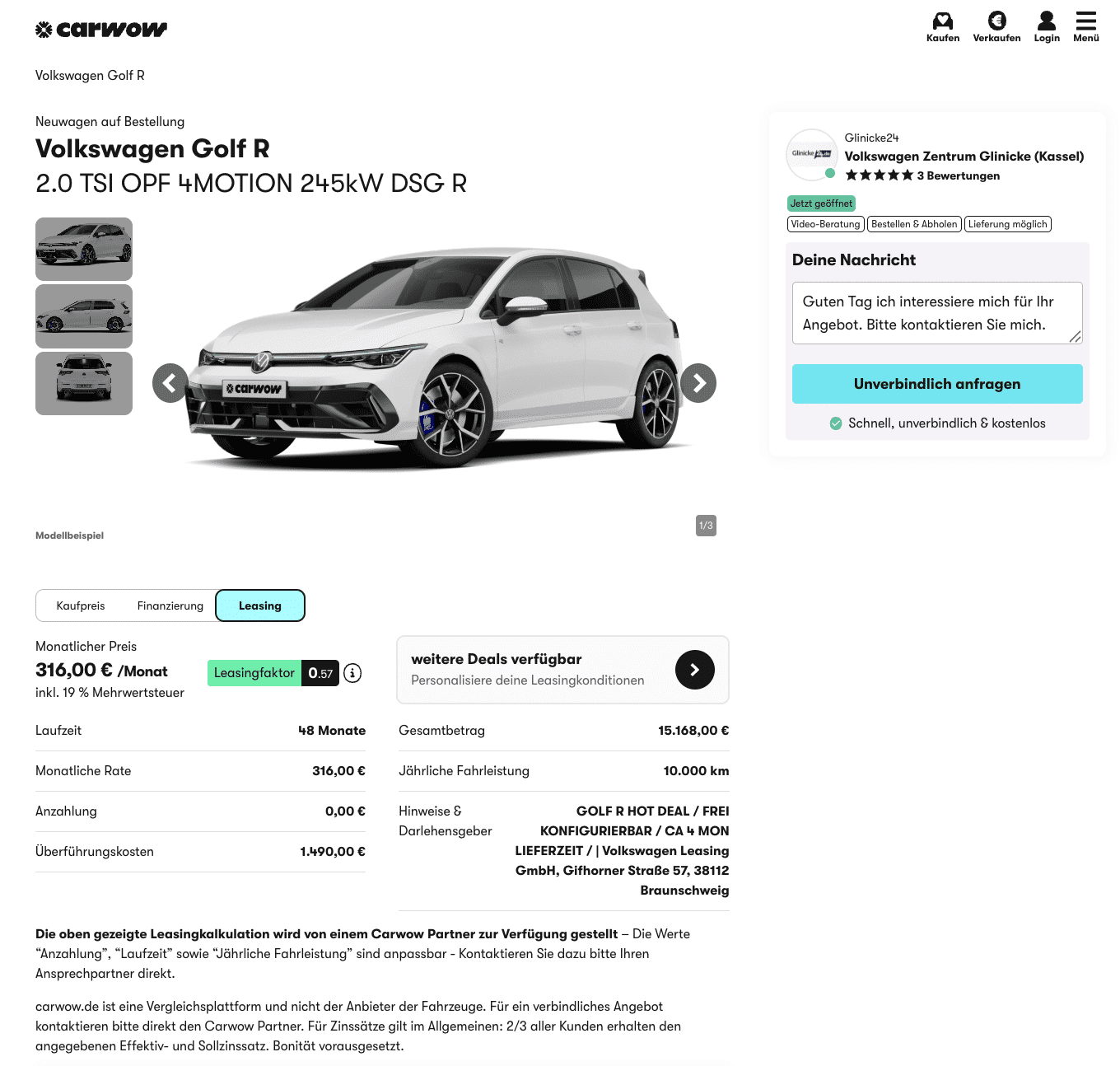 Der Preisvorteil ist deutlich: Während der Marktführer für den gleichen Golf R aktuell rund 650 Euro brutto im Monat verlangt, kostet er hier weniger als die Hälfte, 316 Euro brutto.