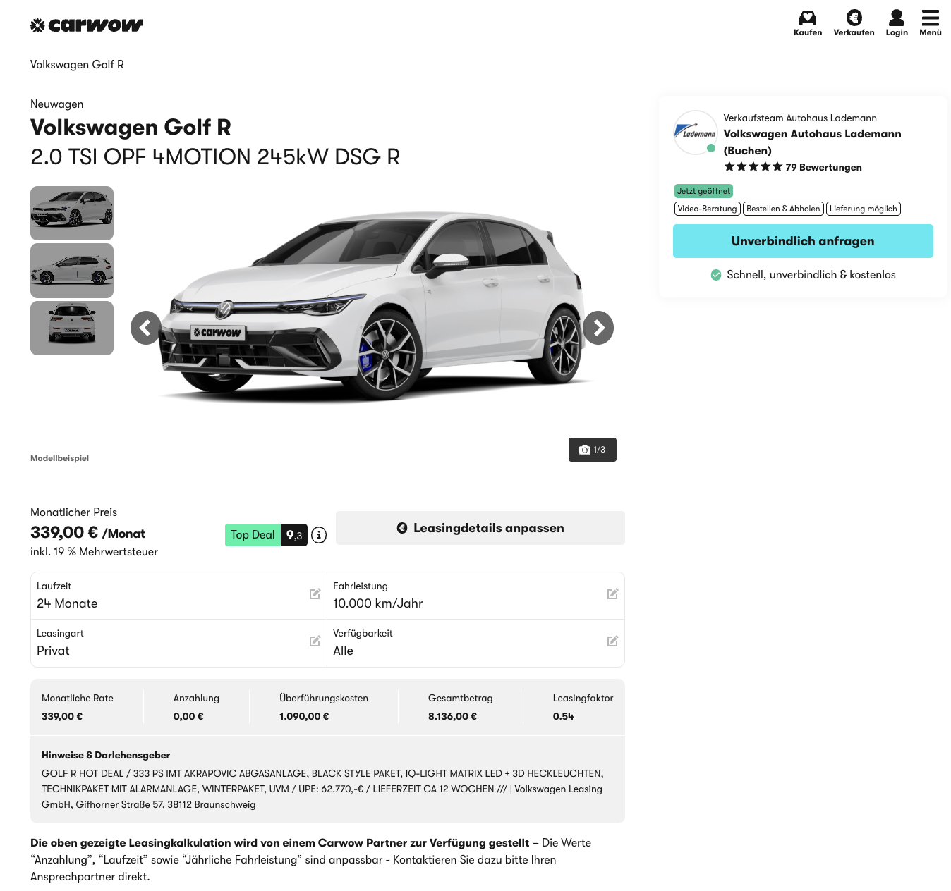 Der VW Golf R ist das leistungsstärkste Serienmodell der Golf-Baureihe und verbindet sportliche Fahrleistungen mit Alltagstauglichkeit. VW Golf R 2.0 TSI OPF 245 kW 4MOTION DSG bei carwow für 339 Euro brutto pro Monat wird hier als Vorlauffahrzeug mit kurzer Lieferzeit von rund 12 Wochen angeboten. Die Kalkulation basiert auf 24 Monaten Laufzeit und 10.000 Kilometern pro Jahr, die Gesamtkosten über zwei Jahre betragen 9.226 Euro, der Leasingfaktor liegt bei 0,54.