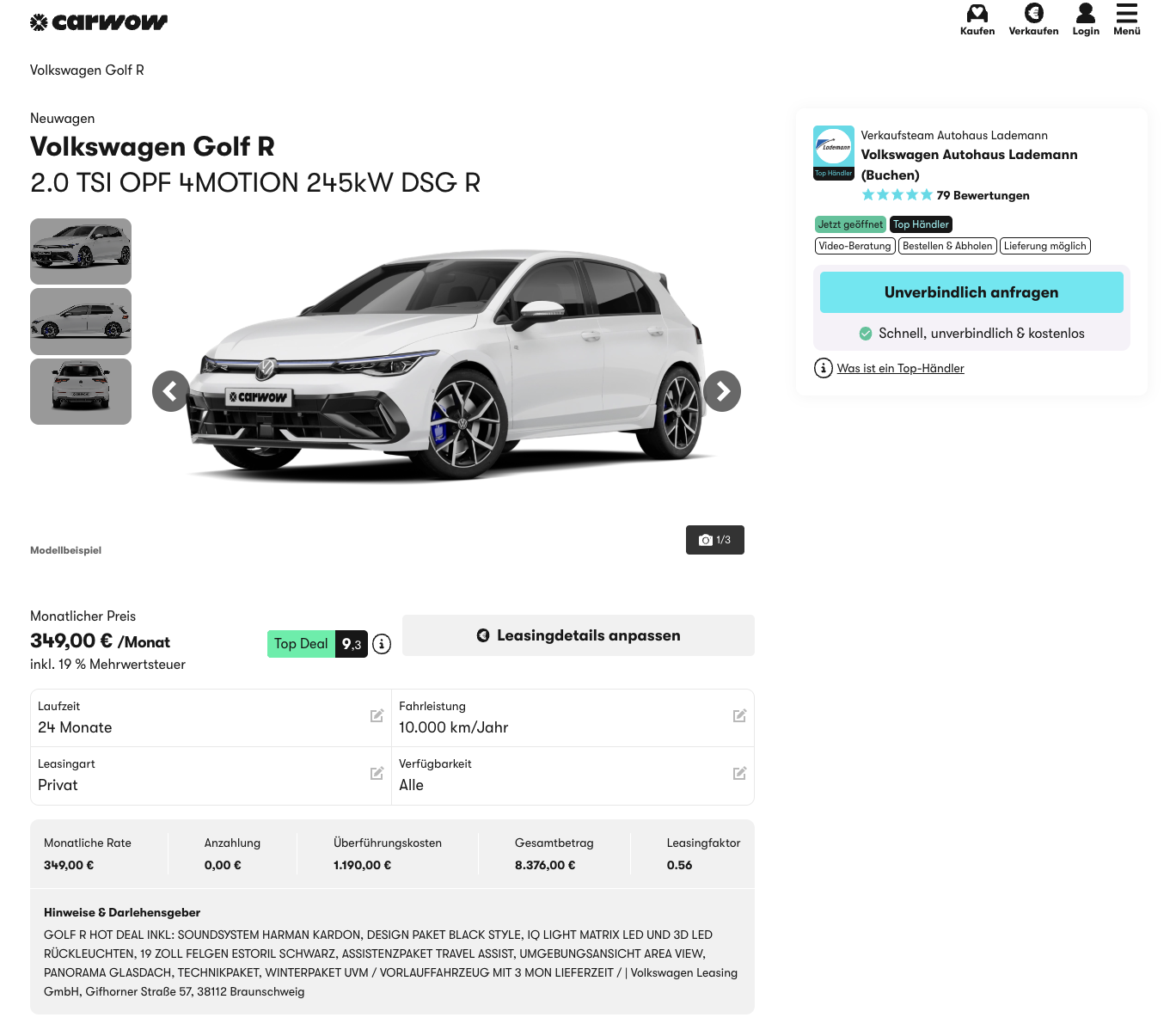 Der Golf R verbindet starke Leistung mit hoher Alltagstauglichkeit und gehört zu den sportlichsten Kompaktmodellen auf dem Markt. VW Golf R 2.0 TSI OPF 245 kW 4MOTION DSG bei carwow für 349 Euro brutto pro Monat ist aktuell als Privatleasing-Angebot verfügbar. Es handelt sich um ein bereits bestelltes Vorlauffahrzeug mit umfangreicher Sonderausstattung, die Lieferzeit beträgt etwa drei Monate.