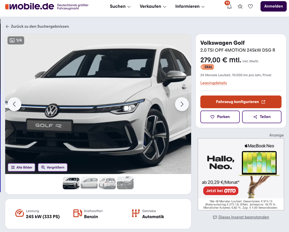 Ein Kompaktsportler, der Leistung und Alltag verbindet. VW Golf R 2.0 TSI OPF 245 kW 4MOTION DSG bei mobile.de für 279 Euro brutto im Monat im Leasing. Das Angebot bezieht sich auf ein frei konfigurierbares Bestellfahrzeug mit etwa vier Monaten Lieferzeit. Für diese Leistungsklasse bleibt die monatliche Rate bemerkenswert niedrig.