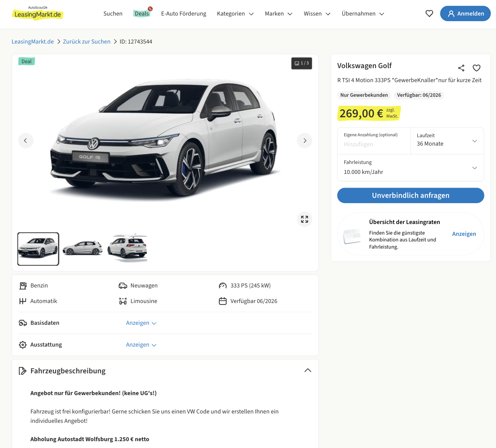 Kalkuliert wurde der Deal mit 36 Monaten Laufzeit und 10.000 Kilometern pro Jahr. Richtig spannend wird das Angebot aber erst im Vergleich, denn während ähnliche Golf-R-Konfigurationen am Markt häufig bei rund 536 Euro netto monatlich liegen, bleibt dieses Leasing mit 269 Euro netto deutlich darunter. Und genau deshalb ist dieser Golf R nicht einfach nur schnell, sondern auch wirtschaftlich auffällig interessant.