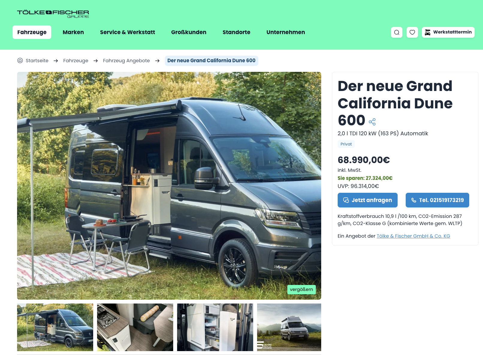 Der VW Grand California 600 2.0 TDI SCR 130 kW DSG Dune bei Tölke+Fischer für 68.990 Euro brutto ist ein Angebot für alle, die den Wunsch nach einem eigenen Reisemobil nicht nur weiterdenken, sondern konkret machen wollen. Der VW Grand California zählt zu den bekanntesten Campern auf Crafter-Basis und bringt genau die Eigenschaften mit, die auf längeren Reisen zählen, viel Platz, eine wohnliche Ausstattung und ein Antrieb, der auch mit voller Beladung nicht überfordert wirkt. Besonders interessant wird das Angebot durch den deutlichen Preisabstand zur UVP von 96.314 Euro. Daraus ergibt sich eine Ersparnis von 27.324 Euro, also rund 30 Prozent Rabatt. In diesem Segment ist das ein echtes Argument. Positiv für die Kalkulation, auch Auslieferungskosten und KFZ-Briefgebühren sind bereits enthalten.
