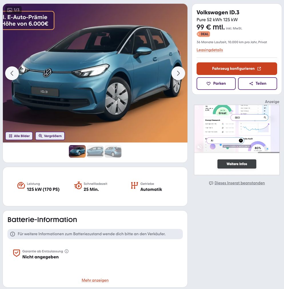 Der Einstieg in die vollelektrische Kompaktklasse war selten so greifbar! VW ID.3 52 kWh 125 kW Pure bei mobile.de für 99 Euro brutto im Monat, gerechnet mit 6.000 Euro Sonderzahlung im Rahmen der aktuellen E-Fahrzeug-Prämie. Das Angebot basiert auf 36 Monaten Laufzeit und 10.000 Kilometern pro Jahr. Da es sich um ein frei konfigurierbares Bestellfahrzeug handelt, lässt sich der ID.3 individuell zusammenstellen. Die Lieferzeit liegt bei rund drei bis vier Monaten.