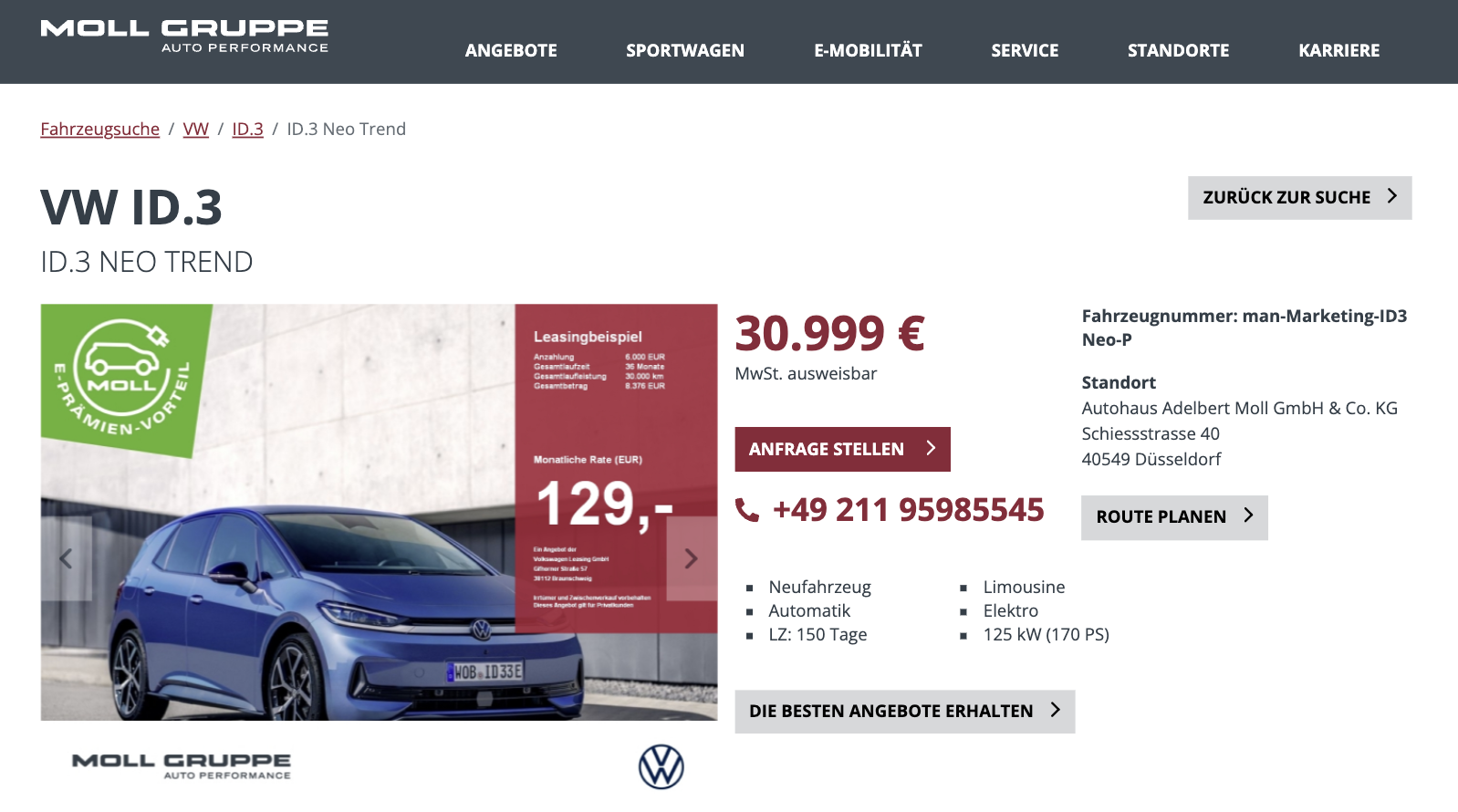 Der ID.3 war für Volkswagen von Anfang an mehr als nur ein weiteres Elektroauto. Inzwischen wirkt das Konzept deutlich ausgereifter, stimmiger und näher an dem, was viele vom elektrischen Gegenstück zum Golf erwarten. VW ID.3 Neo 125 kW Trend bei Moll für 129 Euro brutto im Monat bringt genau diesen Ansatz in ein Leasingangebot, das auf den ersten Blick sehr offensiv kalkuliert ist. Grundlage dafür ist allerdings eine angesetzte Sonderzahlung von 6.000 Euro über die neue E-Fahrzeug-Prämie. Gerechnet wurde mit 36 Monaten Laufzeit und 10.000 Kilometern pro Jahr.