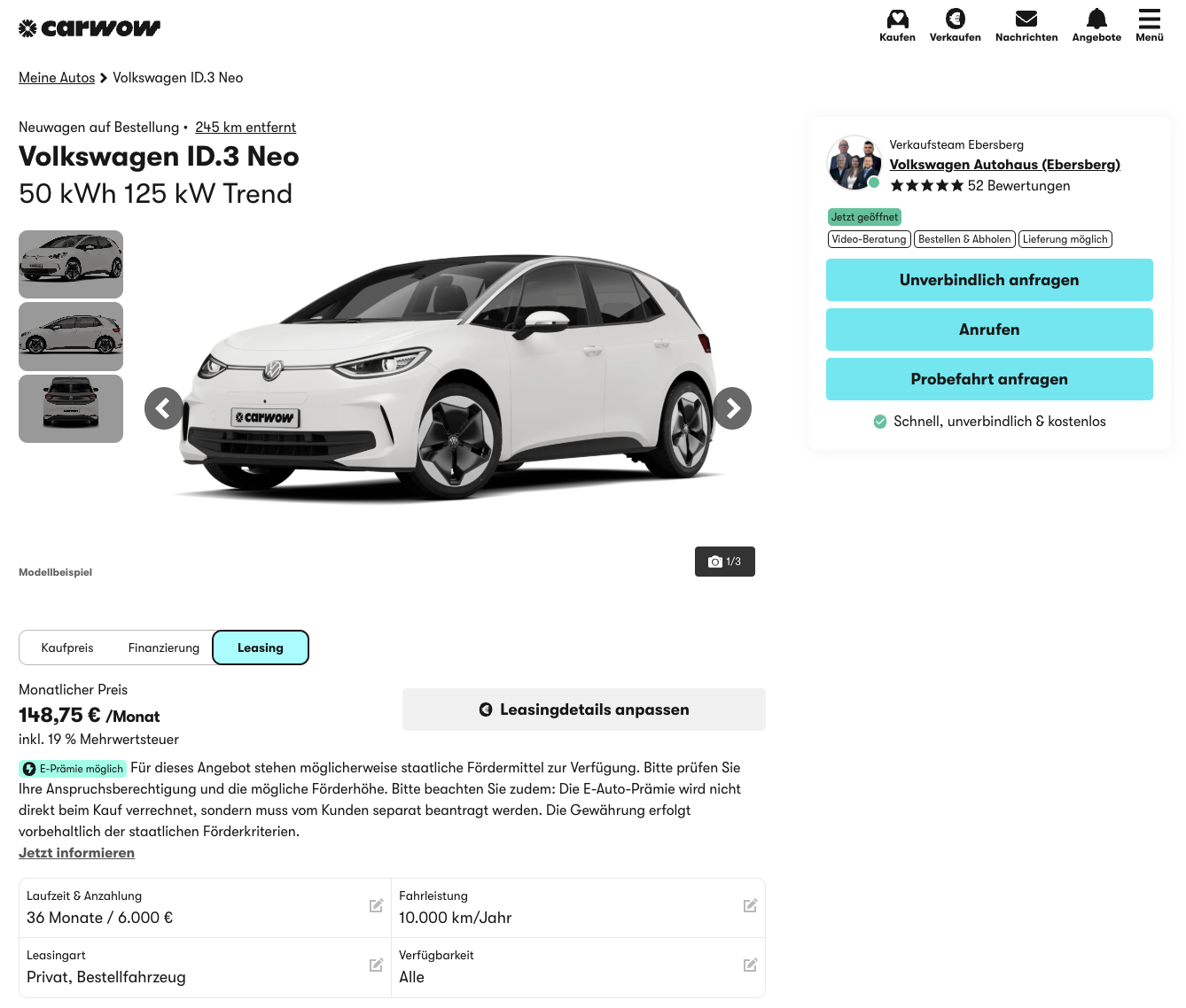 Volkswagen schickt den ID.3 Neo sichtbar geschärft ins Rennen. VW ID.3 Neo 125 kW Trend bei carwow für 148,75 Euro brutto im Monat ist ein Angebot, das zunächst über die niedrige Monatsrate Aufmerksamkeit erzeugt, bei genauerem Hinsehen aber sauber eingeordnet werden muss. Die Berechnung basiert auf der maximalen Umweltprämie von 6.000 Euro, wobei sich die tatsächliche Förderhöhe je nach individueller Einstufung verändern kann. Genau deshalb lohnt der Blick auf die umgerechnete Monatsbelastung. Verteilt man die Prämie realistisch auf die Laufzeit, ergibt sich eine normalisierte Rate von 315,42 Euro brutto pro Monat. Geliefert wird der Stromer als Bestellfahrzeug, aktuell liegt die Lieferzeit bei drei bis vier Monaten.