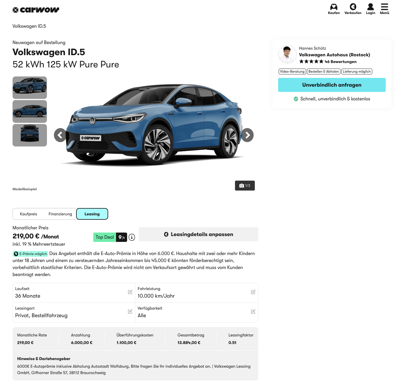Der VW ID.5  positioniert sich als großzügiges Elektro-SUV mit coupéartiger Dachlinie und moderner Technik. VW ID.5 52 kWh 125 kW Pure bei carwow für 219 Euro brutto pro Monat, kalkuliert mit einer Sonderzahlung von 6.000 Euro in Form der Umweltprämie. Das Fahrzeug ist frei konfigurierbar, Farbe, Innenraum und optionale Pakete lassen sich individuell bestimmen.