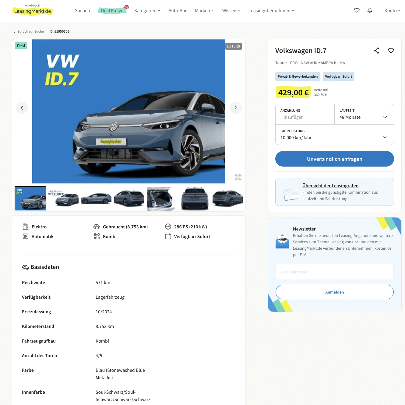 Der Marktführer verlangt für denselben ID.7 Tourer satte 677 Euro brutto im Monat. Hier zahlt ihr 429 Euro, eine monatliche Differenz von 248 Euro. Auf die gesamte Laufzeit macht das mehr als 11.800 Euro Ersparnis.