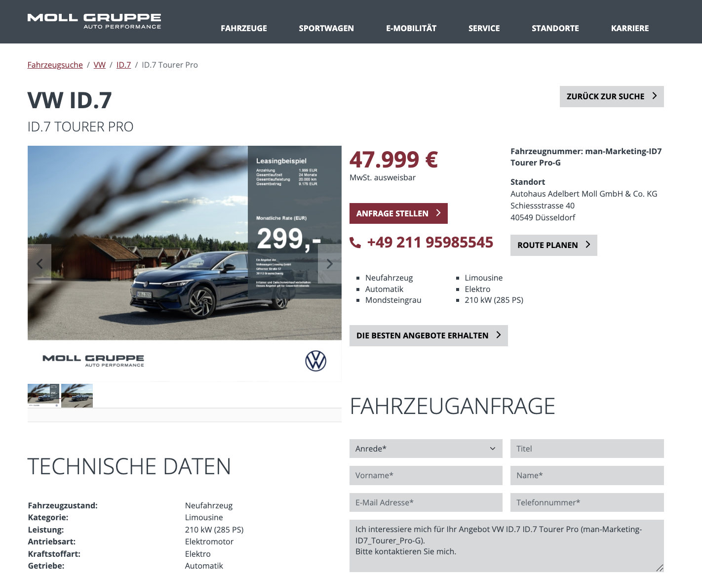 Der VW ID.7 Tourer Pro ist ein elektrischer Kombi für Langstrecke und Alltag, mit viel Platz und hoher Reichweite. VW ID.7 Tourer Pro 210 kW 77 kWh beim Autohaus Moll für 299 Euro netto im Monat, im Geschäftsleasing, bei 1.999 Euro Sonderzahlung. Zur besseren Vergleichbarkeit ergibt sich eine normalisierte Rate von 382,29 Euro. Es handelt sich um ein frei konfigurierbares Bestellfahrzeug, also lässt sich der Wagen passend zum Einsatzprofil zusammenstellen.