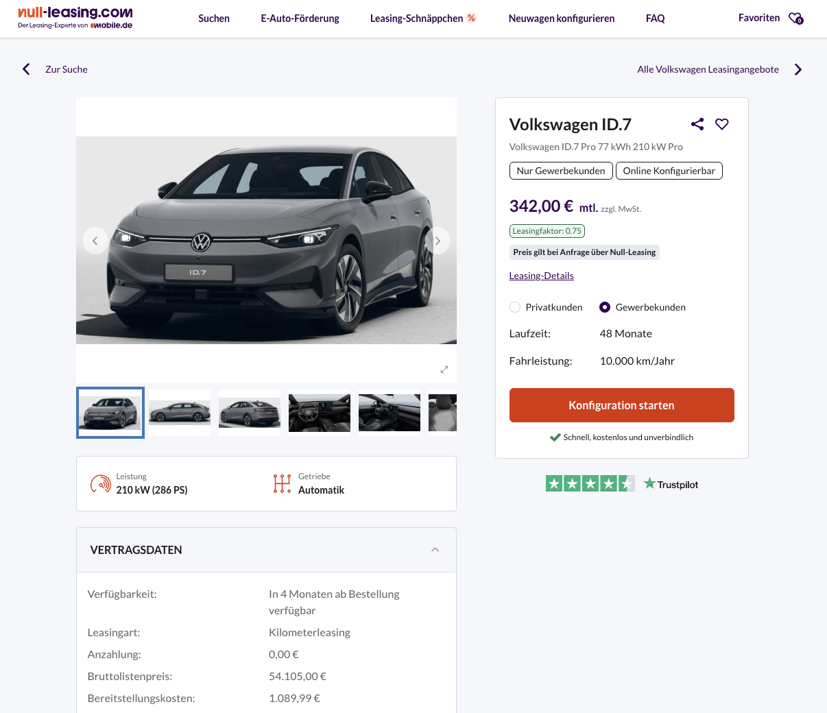 Kalkuliert wurde das Angebot mit einer Laufzeit von 48 Monaten und 10.000 Freikilometer pro Moant. Im direkten Vergleich zum Marktumfeld fällt diese Rate deutlich niedriger aus, denn der Marktführer verlangt für den ID.7 Tourer rund 526 Euro netto pro Monat.