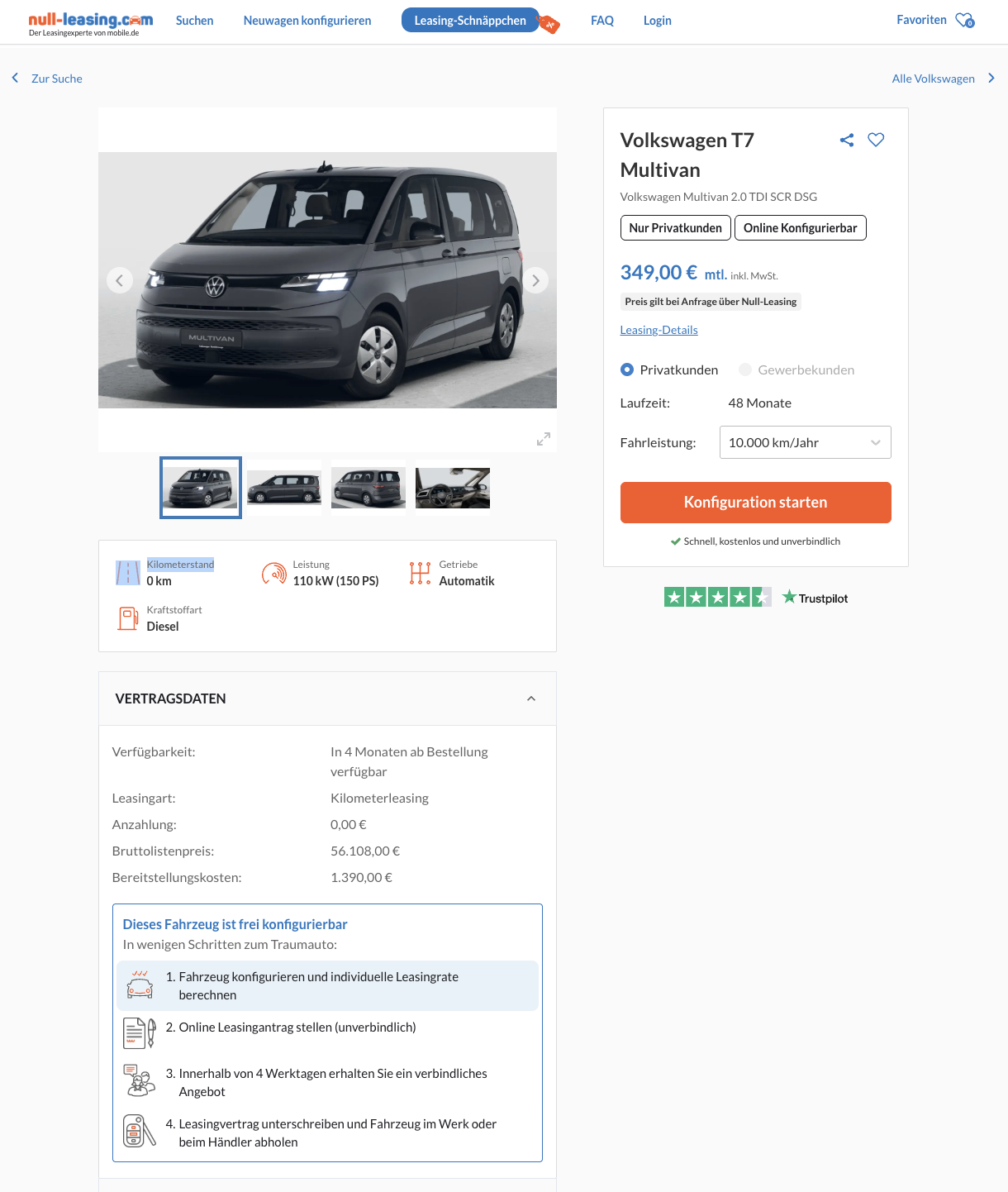 Das Angebot liegt bei 48 Monaten und 10.000 km/Jahr, Anpassungen sind möglich. Im Umfeld zeigt sich der Preisvorteil klar: Beim Platzhirsch kostet der Multivan 506 € brutto/Monat, hier stehen 349 € brutto in der Zeile. Ergebnis: ein moderner Van mit ernsthaftem Nutzwert, ruhigem Antrieb und einem Cockpit, das den Tag strukturiert.