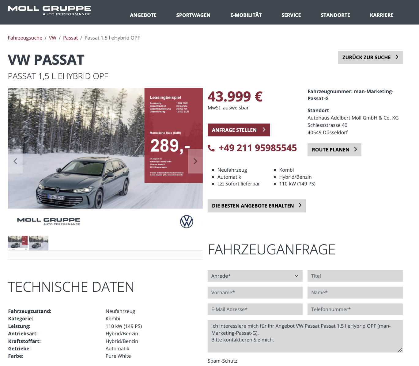 Der VW Passat bleibt auch in der aktuellen Generation ein Fahrzeug für alle, die viel Platz, einen ruhigen Auftritt und moderne Technik in einem stimmigen Gesamtpaket suchen. VW Passat 1.5 eHybrid OPF DSG beim Autohaus Moll für 289 Euro netto im Monat ist dabei vor allem für Geschäftskunden interessant, die einen elektrifizierten Kombi nicht erst konfigurieren und monatelang erwarten möchten. Das Fahrzeug ist als Lagerwagen sofort verfügbar, kommt in Pure White und ist mit schwarzem Interieur ausgestattet. Genau das macht den Deal besonders greifbar, denn hier geht es nicht um ein theoretisches Bestellfahrzeug, sondern um einen Passat, der zeitnah übernommen werden kann.
