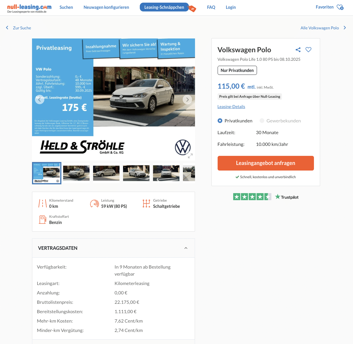 🔥VW Polo im Leasing als Bestellfahrzeug für 115 Euro im Monat brutto