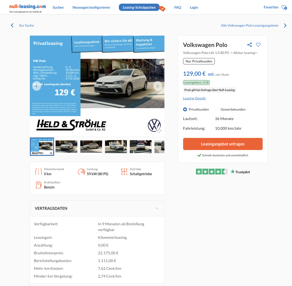Der Polo ist ein klassischer Alltagswagen, und genau deshalb wirkt dieses Angebot so stark. Bei Null-Leasing gibt es im Moment den VW Polo 1.0 59 kW Life im Privatleasing für nur 129 Euro brutto im Monat, als frei konfigurierbares Bestellfahrzeug. Lackierung, Felgen, Innenraum und Pakete bestimmt ihr selbst. Die Lieferzeit liegt bei rund neun Monaten, dafür stimmt am Ende die Ausstattung zu eurem Bedarf, statt dass man beim Preis spart und sich später ärgert.