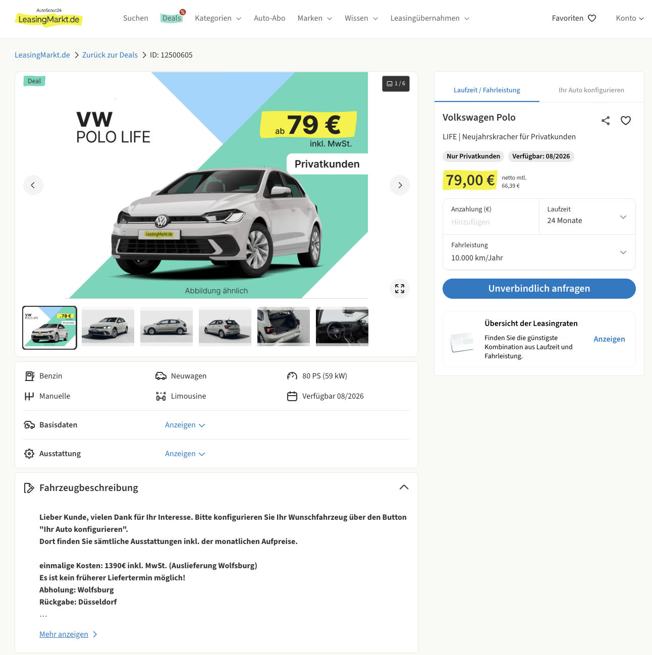 VW Polo im Leasing als Bestellfahrzeug für 79 Euro im Monat brutto