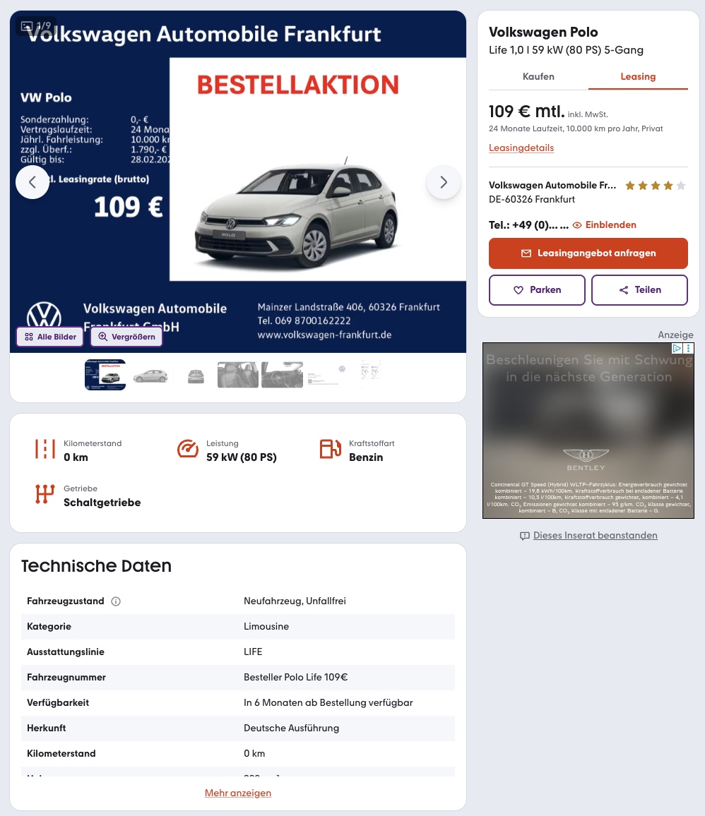 Das Leasingangebot ist auf 24 Monate Laufzeit und 10.000 Kilometer pro Jahr ausgelegt. Diese Kombination sorgt für überschaubare Gesamtkosten und eine kurze Bindung. Im direkten Vergleich wird der Deal besonders deutlich. Während der Marktführer für einen vergleichbaren VW Polo aktuell rund 303 Euro brutto pro Monat verlangt, liegt dieses Angebot bei 109 Euro brutto. Damit rückt der Polo preislich wieder in den Bereich, in dem er für viele Käufer interessant ist, als solider, moderner Kleinwagen mit klar kalkulierbarer Monatsrate und ohne unnötige Komplexität.