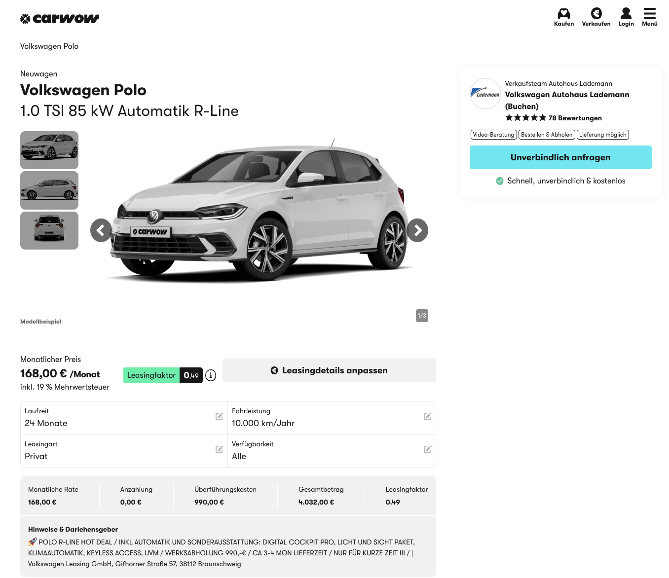 Der VW Polo ist seit Jahren eine sichere Wahl, wenn ein Kleinwagen gesucht wird, der sich im Alltag erwachsen anfühlt. VW Polo 1.0 TSI 85 kW DSG R-Line bei carwow für 168 Euro brutto im Monat im Privatleasing ist dabei ein Angebot, das vor allem wegen der Ausstattung und der fairen Monatsrate auffällt. Das Fahrzeug kommt vorkonfiguriert und bringt bereits eine umfangreiche Sonderausstattung mit. Kalkuliert ist der Deal mit 24 Monaten Laufzeit und 10.000 Kilometern pro Jahr, die Lieferzeit liegt bei drei bis vier Monaten, also im üblichen Rahmen für ein attraktives Privatleasing-Angebot.