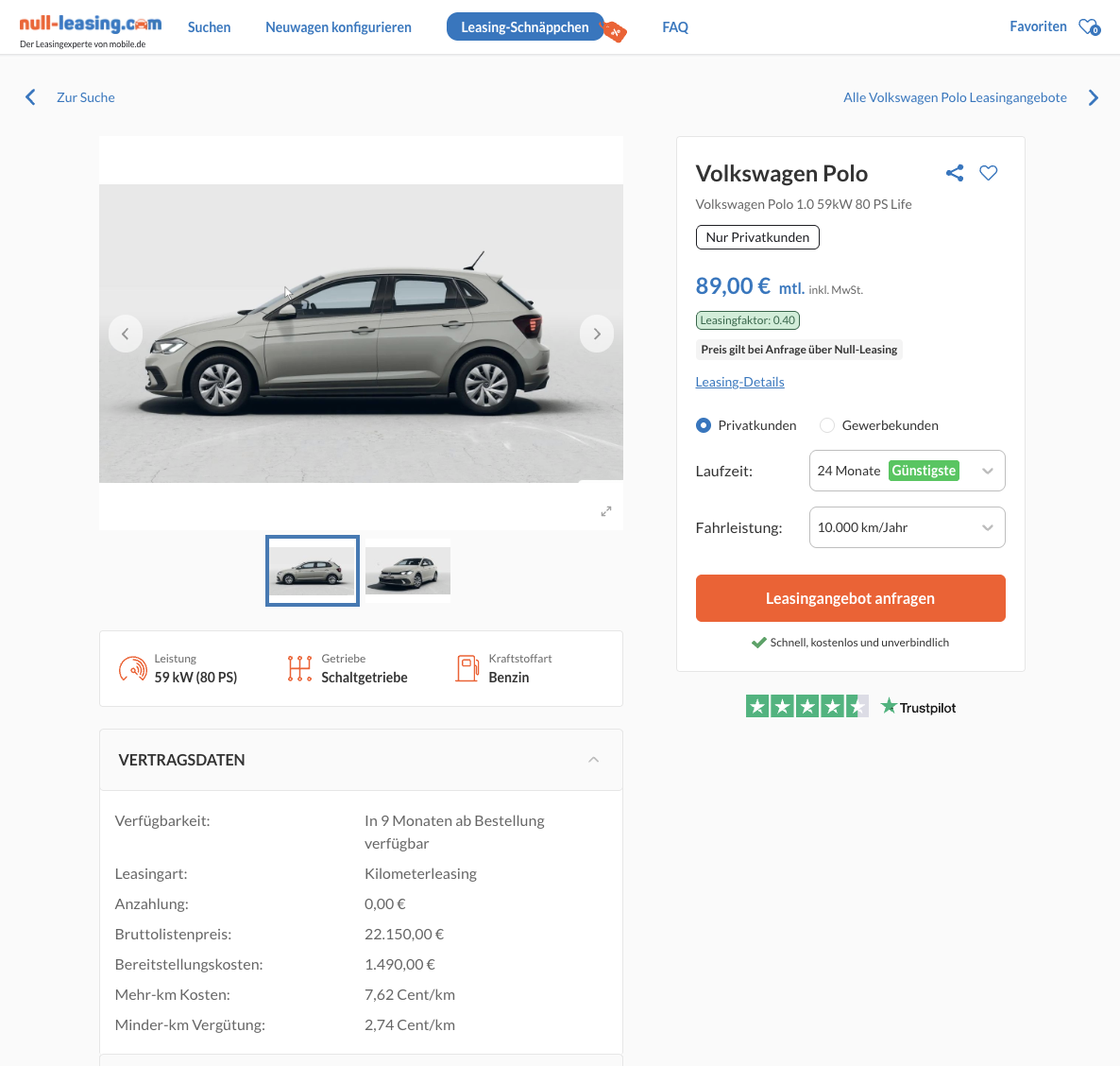 Der VW Polo ist ein kompakter Kleinwagen für alle, die ein unkompliziertes Auto für Alltag und Pendelstrecken suchen. VW Polo 1.0 59 kW Life bei Null-Leasing für 89 Euro brutto im Monat ist ein Privatleasing-Angebot, das vor allem über die niedrige Rate überzeugt. Es handelt sich um ein frei konfigurierbares Bestellfahrzeug, Farbe und Ausstattung können also passend gewählt werden, die Lieferzeit beträgt rund neun Monate.