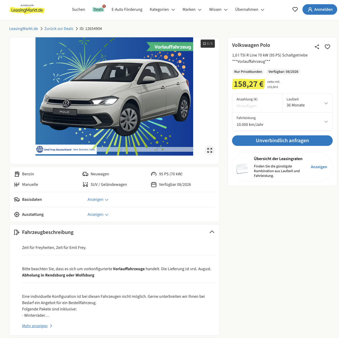 Berechnet ist das Leasing mit 36 Monaten Laufzeit und 10.000 Kilometern pro Jahr, Anpassungen sind in der Regel möglich. Mit 158,27 Euro brutto pro Monat ist das ein Polo R-Line, der preislich deutlich unter vielen vergleichbaren Angeboten liegt.