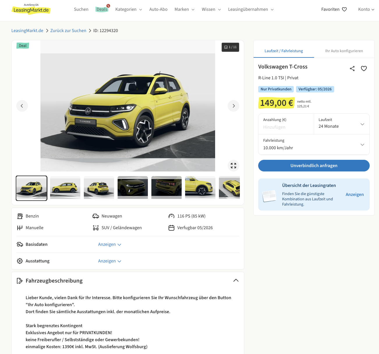 Kalkuliert ist das Angebot mit 24 Monaten und 10.000 Kilometern pro Jahr, beides anpassbar. Im Vergleich wirkt die Rate extrem stark, denn im Marktumfeld liegt das identische Modell bei rund 314 Euro brutto pro Monat, hier seid ihr mit 149 Euro deutlich gĂĽnstiger unterwegs.