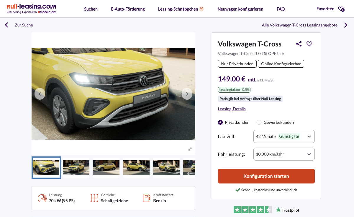 Die Kalkulation basiert auf 42 Monaten Laufzeit und 10.000 Kilometern pro Jahr, Anpassungen sind möglich. Besonders auffällig wird der Deal beim Preisvergleich. Während ein vergleichbarer T-Cross beim Marktführer aktuell bei rund 283 Euro im Monat liegt, steht dieses Angebot mit 149 Euro brutto monatlich deutlich günstiger da. Wer ein vernünftiges, flexibel konfigurierbares SUV mit sauberer Ausstattung sucht, findet hier eine Offerte, die preislich klar aus dem Rahmen fällt, im positiven Sinn.