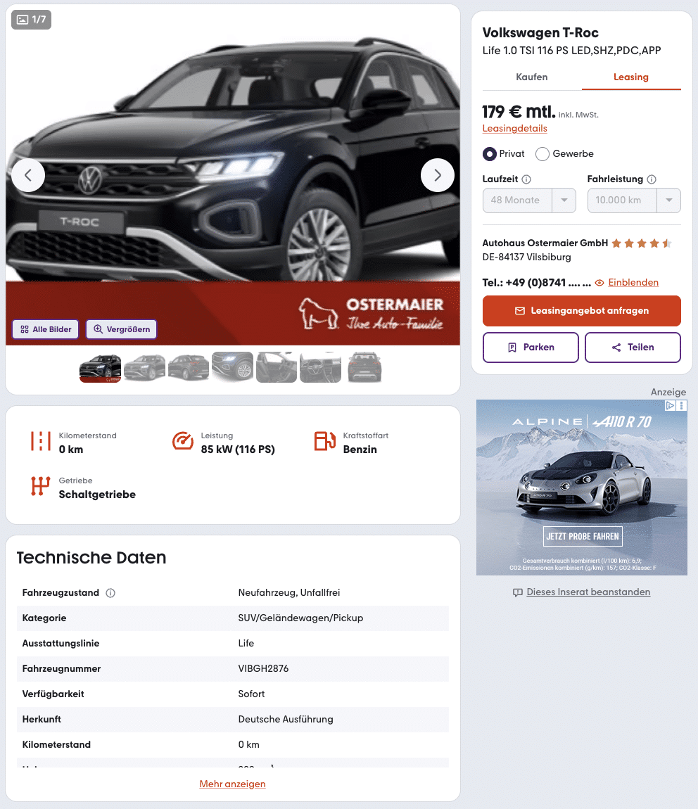 Er ist kompakt, modern und trifft genau den Nerv der Zeit: der VW T-Roc 1.0 TSI 85 kW OPF Life. Bei mobile.de gibt es den beliebten Kompakt-SUV aktuell im Leasing für 179 Euro brutto im Monat – und das als sofort verfügbaren Lagerwagen in edlem Grenadillschwarz Metallic. Das Angebot bezieht sich auf das Vor-Facelift-Modell (A1), das mit seiner zeitlosen Linienführung und bewährten Technik ein echtes Schnäppchen darstellt.