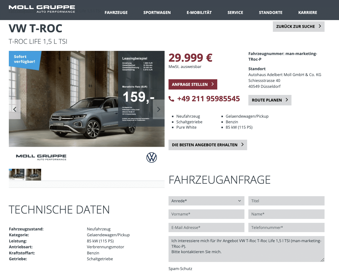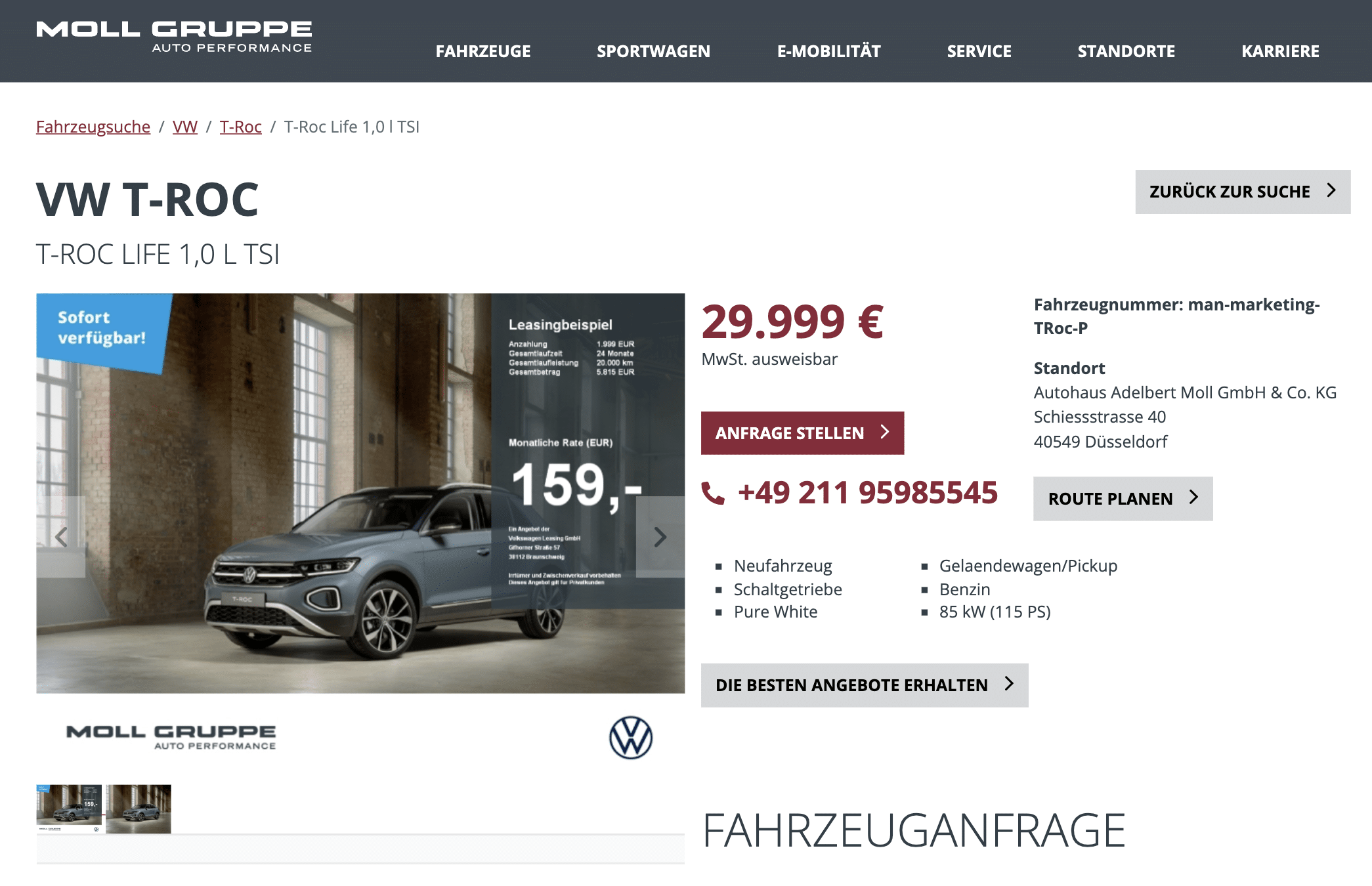 Autohaus Moll macht euch den Einstieg leicht, denn der VW T-Roc 1.5 TSI 110 kW OPF Life steht dort für 159 Euro brutto im Monat, dazu kommt eine Sonderzahlung von 1.999 Euro, wodurch die Überführungskosten entfallen. Für die Vergleichbarkeit zählt die normalisierte Rate von 242,29 Euro, fair, transparent, direkt auf den Punkt. Der Wagen ist sofort verfügbar, ihr steigt also ohne Warterei ein und fahrt mit frischer Technik vom Hof.