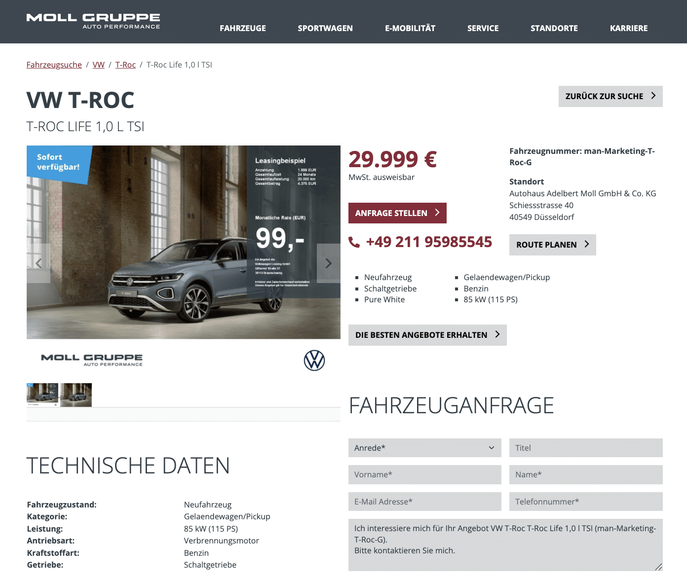 Bei Autohaus Moll wartet der VW T-Roc 1.0 TSI 85 kW OPF Life auf euch, im Geschäftsleasing für 99 Euro netto pro Monat, dazu kommen 1.999 Euro Sonderzahlung und Überführungskosten. Um die Kalkulation sauber vergleichbar zu machen, wird die Anzahlung auf die Laufzeit verteilt, daraus ergibt sich eine normalisierte Rate von 182,29 Euro netto. Privatkunden steigen mit 159 Euro brutto pro Monat ein, die Anzahlung bleibt identisch. Der wichtigste Punkt für alle, die keine Geduld haben, lautet sofort verfügbar, Schlüssel drehen, losfahren, ohne Lieferzeit und ohne Konfigurator Marathons.