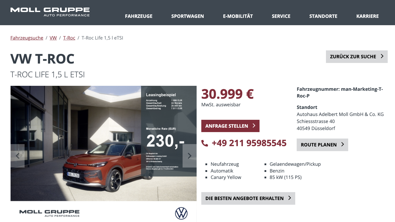 Der Deal basiert auf 24 Monaten Laufzeit und 10.000 Kilometern pro Jahr bei 1.999 Euro Anzahlung. Rechnet man die Anzahlung ein, bleibt die effektive Monatsrate von 313,29 Euro brutto. Zum Vergleich, der Marktführer liegt für einen ähnlich konfigurierten T-Roc Life aktuell bei 407 Euro brutto pro Monat. Damit bietet das Autohaus Moll einen T-Roc mit moderner Technik, Life Ausstattung und spürbarem Preisvorteil in einem Paket, das sich in der Kostenübersicht klar abhebt.