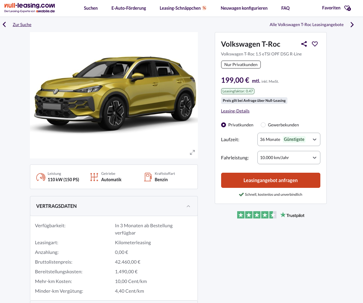 Kalkuliert wurde das Privatleasing mit 36 Monaten Laufzeit und 10.000 Kilometern pro Jahr. Vergleichbare T-Roc R-Line Angebote liegen am Markt teils bei rund 440 Euro brutto pro Monat. Genau dadurch wird dieser Deal besonders spannend.