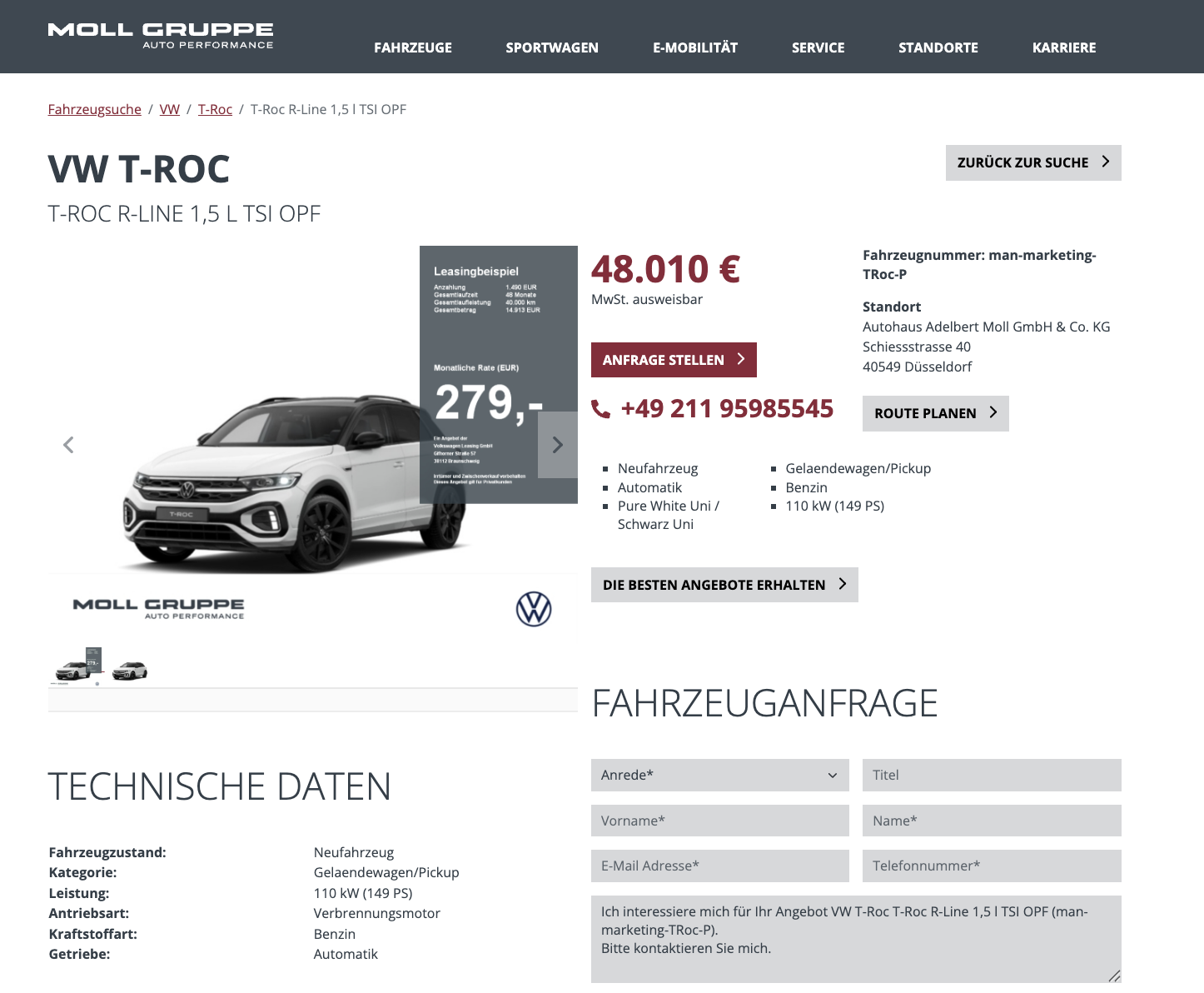 Das Angebot von Autohaus Moll ist mit 48 Monaten Laufzeit und 10.000 Kilometern pro Jahr hinterlegt, andere Profile lassen sich in der Regel anpassen. Damit bekommt ihr einen VW T-Roc 1.5 TSI DSG R-Line Vorfacelift, klar kalkuliert, gut ausgestattet und optisch genau für alle geeignet, die bewusst beim bewährten T-Roc Design bleiben möchten.