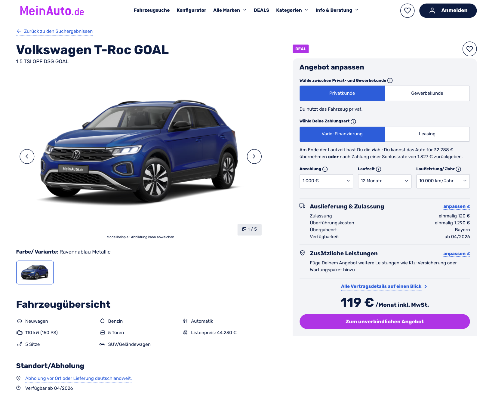 Ein Jahr SUV fahren, danach neu entscheiden. VW T-Roc 1.5 TSI 110 kW DSG Goal bei MeinAuto für 119 Euro brutto im Monat, kalkuliert mit 1.000 Euro Sonderzahlung, ist genau auf dieses Szenario zugeschnitten. Die Laufzeit beträgt 12 Monate bei 10.000 Kilometern pro Jahr. Es handelt sich um ein bereits bestelltes Vorfacelift-Modell mit 150 PS und umfangreicher Ausstattung.