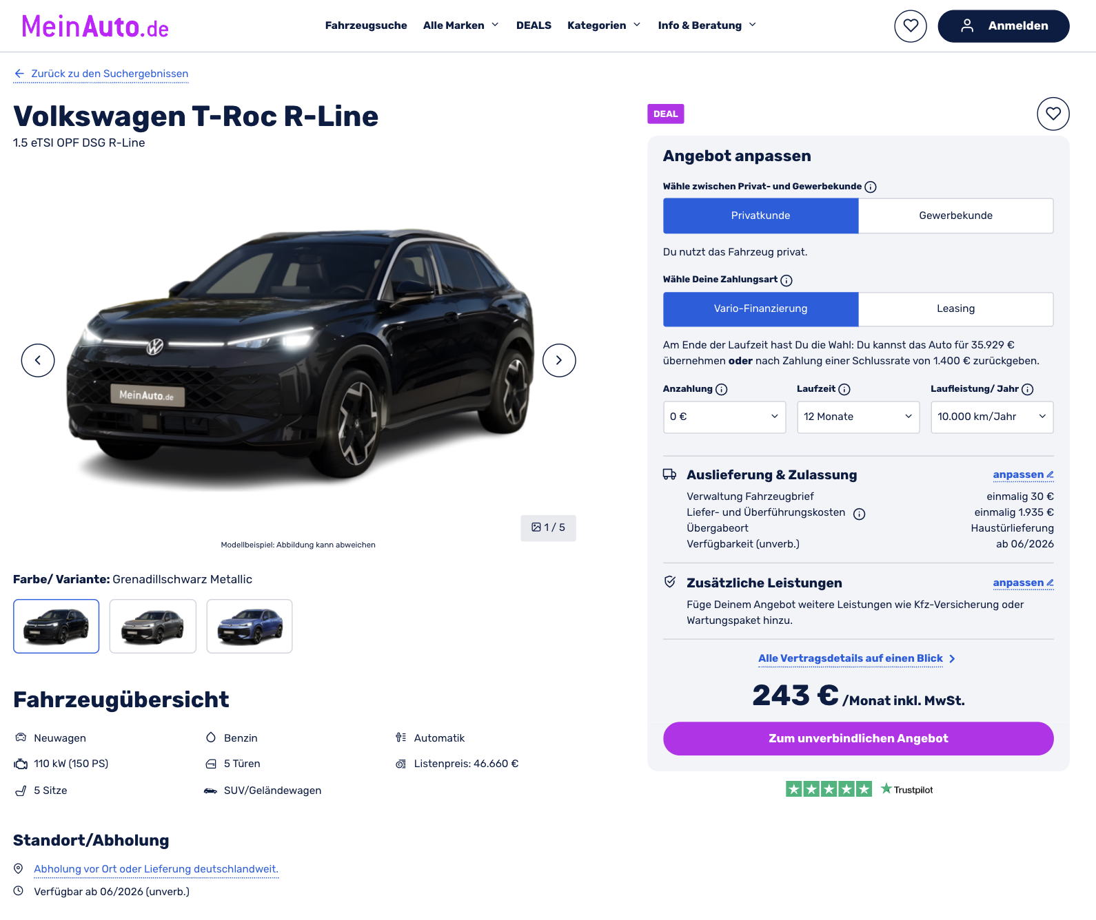 Der VW T-Roc bleibt einer dieser SUVs, die fast immer passen, kompakt genug für die Stadt, groß genug für den Alltag und in der R-Line angenehm sportlich. VW T-Roc 1.5 eTSI OPF DSG R-Line bei MeinAuto für 243 Euro brutto im Monat kommt als bereits bestelltes Fahrzeug ins Vario-Leasing. Ab Juni ist er in Grenadillschwarz Metallic, Wolf Grey Metallic oder Celestial Blue Metallic verfügbar.