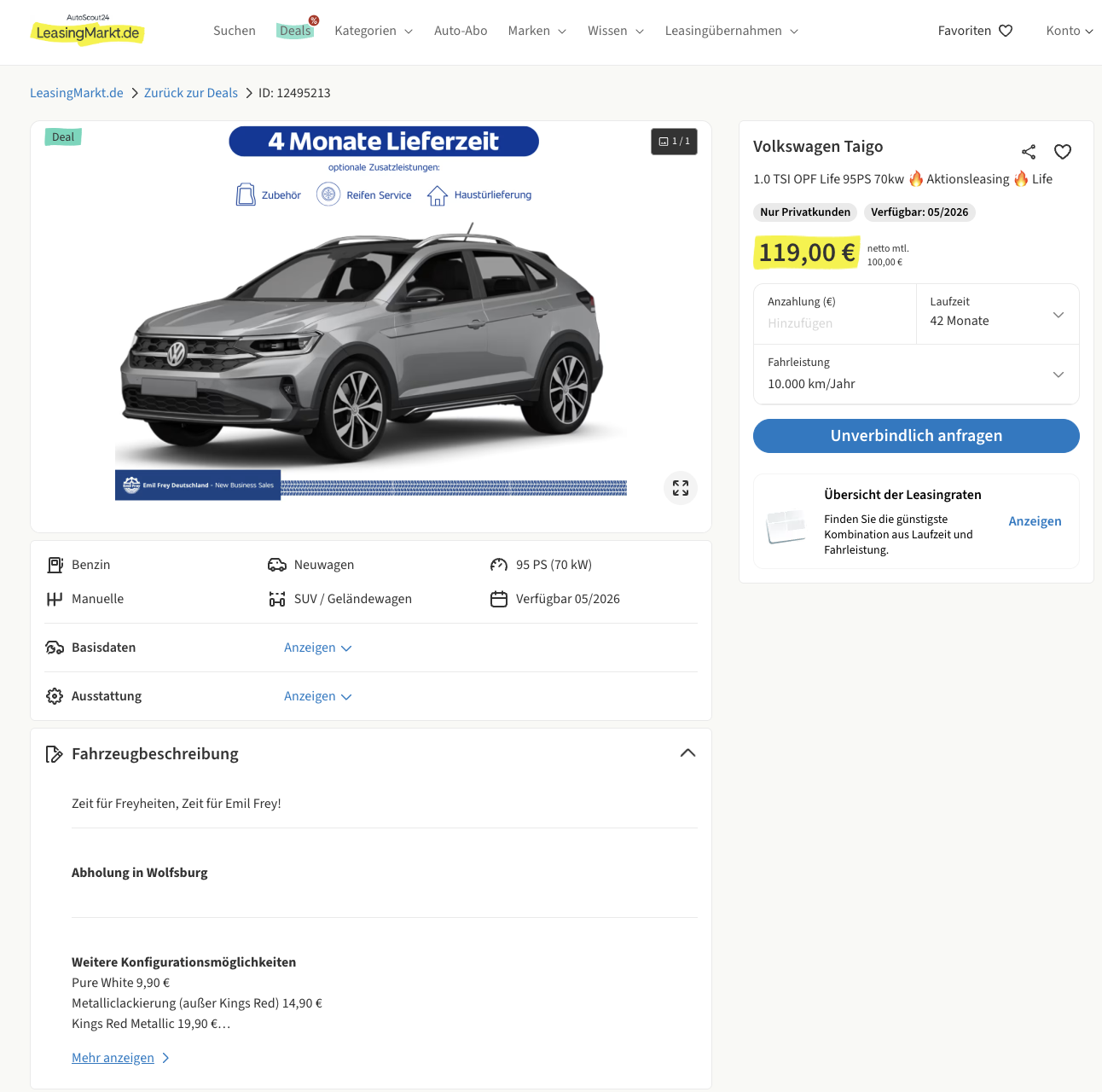 Das Leasing ist auf 42 Monate Laufzeit und 10.000 Kilometer pro Jahr kalkuliert, Anpassungen sind in der Regel möglich. Entscheidend bleibt die monatliche Rate, denn 119 Euro brutto für einen frei konfigurierbaren VW-Crossover sind aktuell kaum zu unterbieten. Wer einen modernen, sparsamen Alltagswagen sucht und den Kostenpunkt klar in den Mittelpunkt stellt, findet im Taigo ein sehr ausgewogenes Angebot.