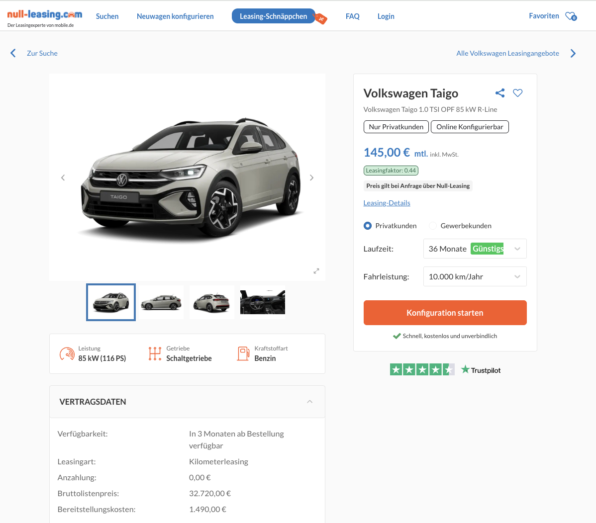 VW Taigo im Leasing als Bestellfahrzeug für 145 Euro im Monat brutto