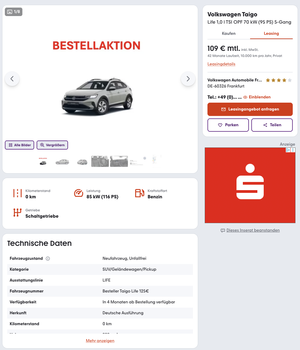 Der VW Taigo ist ein praktischer Alltagswagen mit moderner Optik, der sich besonders für Stadt, Pendelstrecke und kurze Autobahnetappen eignet. VW Taigo 1.0 TSI OPF 70 kW Life bei mobile.de für 109 Euro brutto im Monat ist ein Privatleasing-Angebot als Bestellaktion, wodurch sich das Fahrzeug individuell konfigurieren lässt. Die Lieferzeit liegt bei rund vier Monaten, was für ein frei zusammengestelltes Fahrzeug ein gut planbarer Zeitraum ist.