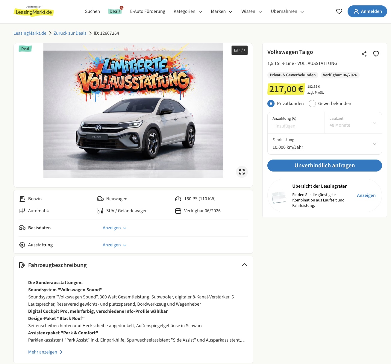 Kalkuliert wurde das Leasing mit 48 Monaten Laufzeit und 10.000 Kilometern pro Jahr. Spannend wird der Deal vor allem beim Blick auf vergleichbare Angebote im Markt. Für ähnlich motorisierte und ausgestattete Modelle werden häufig rund 462 Euro brutto pro Monat verlangt. Genau deshalb wirkt dieser Taigo nicht wie ein nettes Randangebot, sondern wie ein SUV-Deal mit echtem Preisargument. Wer ein kompaktes, stark ausgestattetes und spürbar dynamischeres Volkswagen-SUV sucht, bekommt hier ein Angebot, das sich klar vom Standard abhebt.