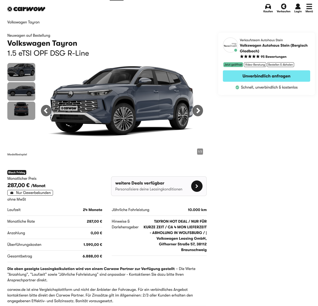 Das Angebot bei carwow ist für 24 Monate Laufzeit und 10.000 Kilometer pro Jahr kalkuliert, beide Werte lassen sich anpassen. Im Umfeld fällt der Unterschied deutlich auf, denn der Platzhirsch verlangt für einen vergleichbaren Tayron aktuell 645 Euro netto im Monat, also mehr als das Doppelte. Damit wird der VW Tayron 1.5 eTSI OPF DSG R-Line bei carwow zu einem großen SUV mit viel Platz, moderner Technik und einer Rate, die in der Excel Übersicht angenehm unaufgeregt bleibt.