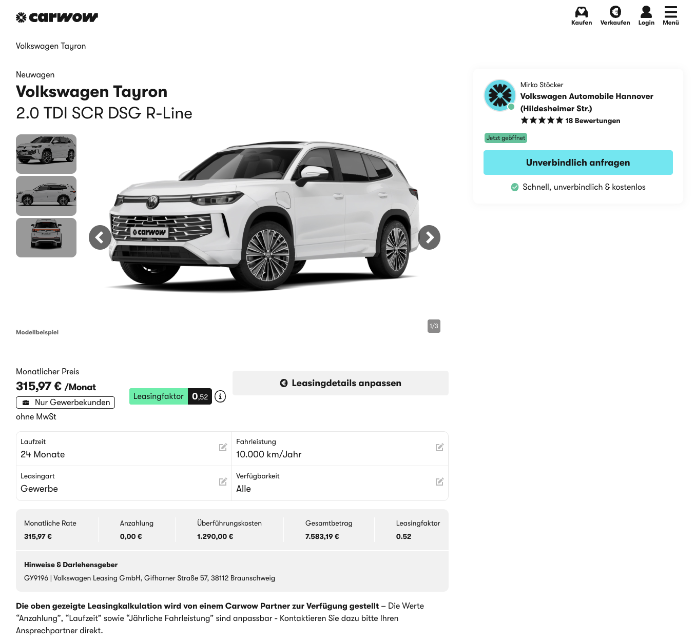 Kalkuliert ist das Geschäftsleasing mit 24 Monaten und 10.000 Kilometern pro Jahr, Anpassungen sind möglich. Der Platzhirsch verlangt für einen vergleichbaren Tayron aktuell 676 Euro netto pro Monat, damit liegt dieses Angebot deutlich darunter.