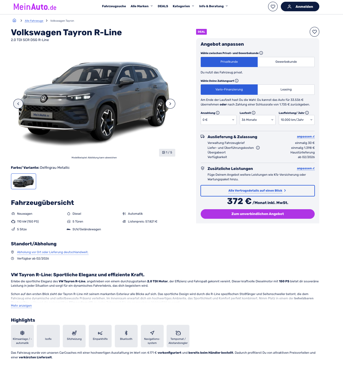Der VW Tayron zielt auf Langstrecke, Raum und Ruhe im Fahrerlebnis. VW Tayron 2.0 TDI SCR DSG R Line bei MeinAuto mit Vario Leasing und Übernahmeoption für 33.536 Euro, alternativ ist nach 36 Monaten die Rückgabe möglich, dann fällt eine Schlussrate von 1.735 Euro an. Das SUV ist bereits bestellt, kommt in Delfingrau Metallic und soll im Februar 2026 ausgeliefert werden, also kein Konfigurator Luftschloss, sondern ein konkret eingeplantes Fahrzeug.