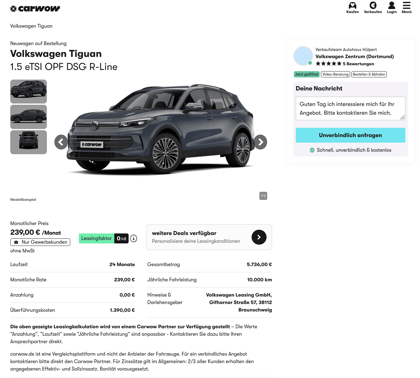 Manche Deals klingen fast zu gut, um wahr zu sein und doch gibt es sie. Der VW Tiguan 1.5 eTSI OPF DSG in der R-Line ist bei carwow aktuell im Geschäftsleasing schon für 239 Euro netto im Monat zu haben. Ein frei konfigurierbares Bestellfahrzeug, ganz nach euren Vorstellungen und das zu Konditionen, die locker mehrere Hundert Euro unter dem liegen, was der Marktführer verlangt. Für alle, die im Job Eindruck machen wollen und privat nicht auf Fahrspaß verzichten möchten, ist dieser Tiguan die perfekte Wahl.
