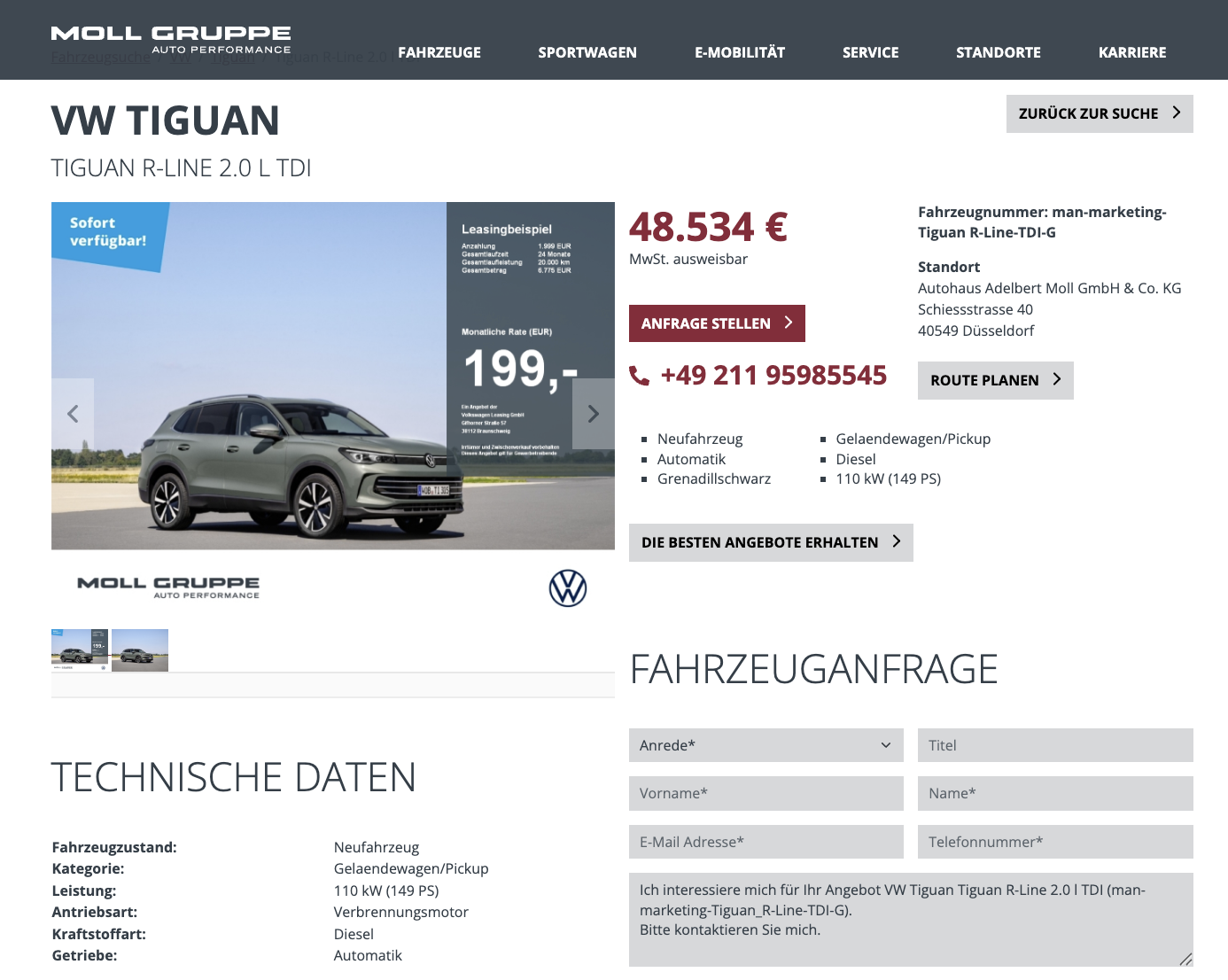 Das Angebot ist auf 24 Monate Laufzeit und 10.000 Kilometer pro Jahr gerechnet. Beim Platzhirsch ist der Tiguan aktuell nur auf Anfrage erhältlich, hier stehen die Zahlen direkt fest und machen die Planung einfacher.