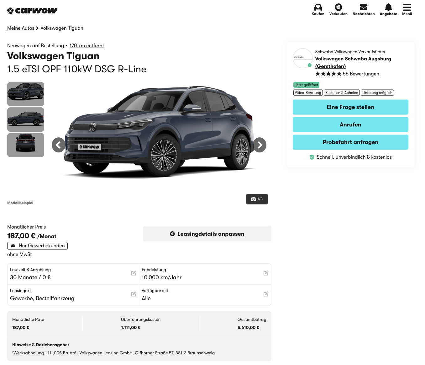 Seine größte Wirkung entfaltet dieses Angebot beim Blick auf den Markt. Während ein vergleichbarer Tiguan beim Platzhirsch aktuell bei rund 430 Euro netto pro Monat liegt, bleibt dieses Angebot bei 187 Euro netto. Genau dieser Abstand macht den Unterschied. So wird aus einem ohnehin beliebten SUV ein Geschäftsleasing, das preislich deutlich aus dem Rahmen fällt und gerade deshalb besonders interessant ist.