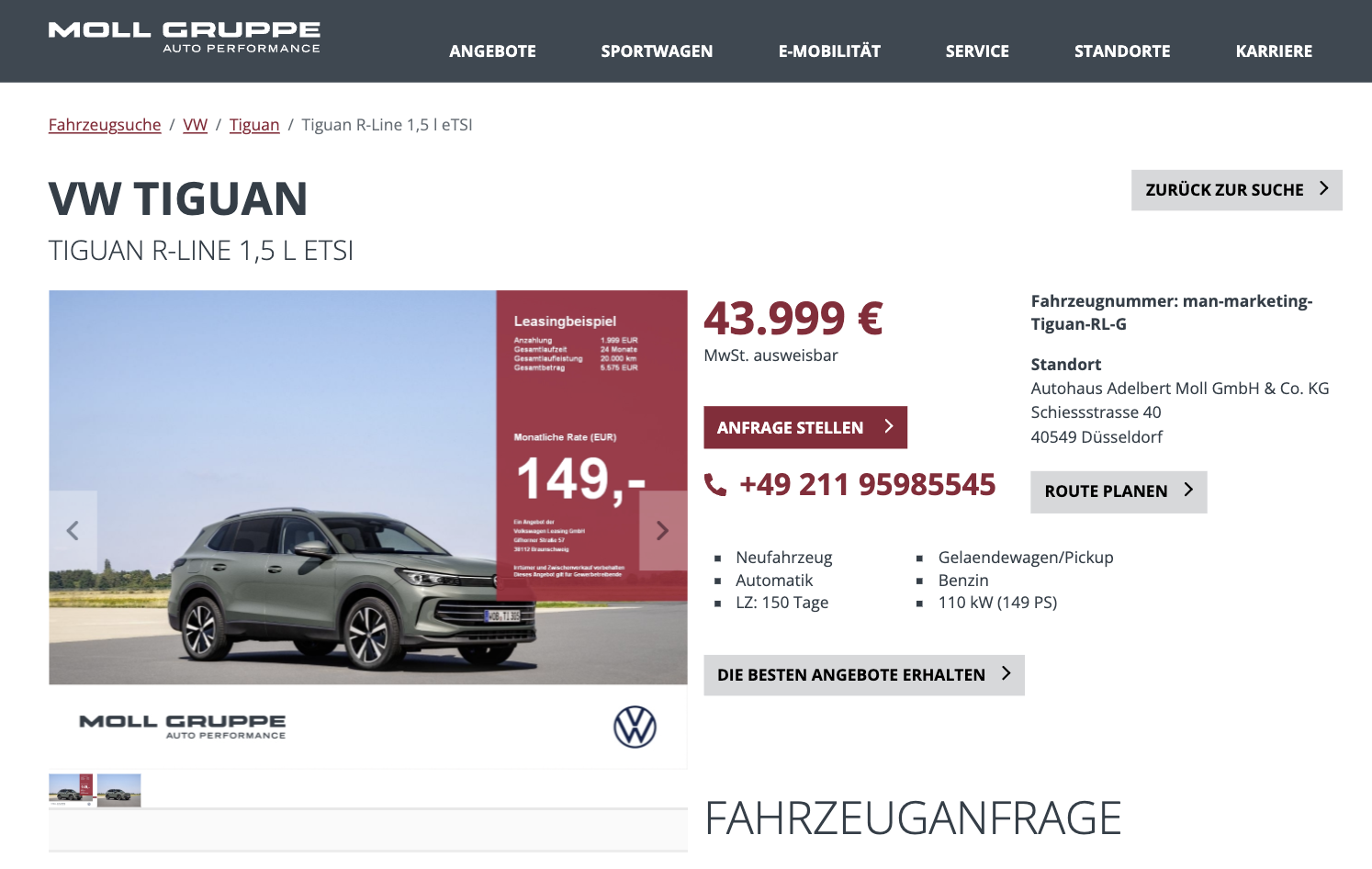 Richtig eindrucksvoll wird dieses Angebot beim Blick auf die Konkurrenz. Während der Platzhirsch für den VW Tiguan R-Line rund 391 Euro netto pro Monat verlangt, liegt das Autohaus Moll mit 149 Euro netto deutlich darunter. Genau dieser Abstand macht den Unterschied und hebt das Angebot aus der Masse heraus. Wer ein aktuelles SUV mit starker Optik, moderner Technik und viel Nutzwert sucht, bekommt hier eine Offerte, die preislich fast schon überraschend wirkt.