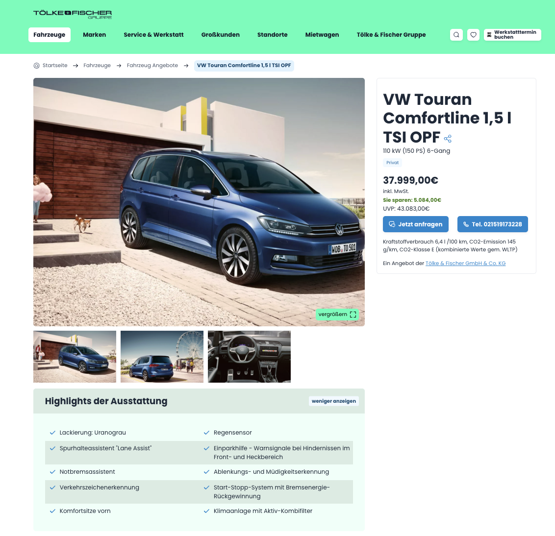 Viel Raum, klare Bedienung, entspannt im Alltag. Bei Tölke+Fischer gibt es den VW Touran 1,5 l TSI OPF 110 kW Comfortline als Kaufdeal für 37.999 €, mit einem Preisvorteil liegt bei 5.084 €, ein Familienpaket mit Substanz und transparenter Rechnung.