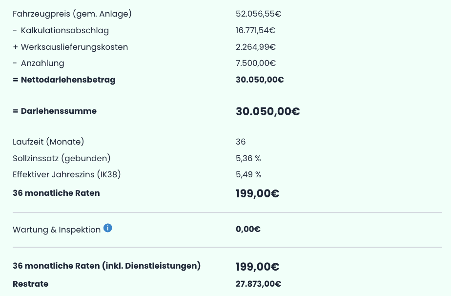Die Finanzierung wurde mit 36 Monaten Laufzeit und einer Anzahlung von 7.500 Euro berechnet. Der effektive Jahreszins liegt bei 5,49 Prozent. Nach Ablauf der Laufzeit besteht die Möglichkeit, das Fahrzeug über eine Schlussrate von 27.873 Euro zu übernehmen. Der Nettodarlehensbetrag beträgt 30.050 Euro. Hinzu kommen Werksauslieferungskosten von 2.264,99 Euro für die Abholung des Fahrzeugs.