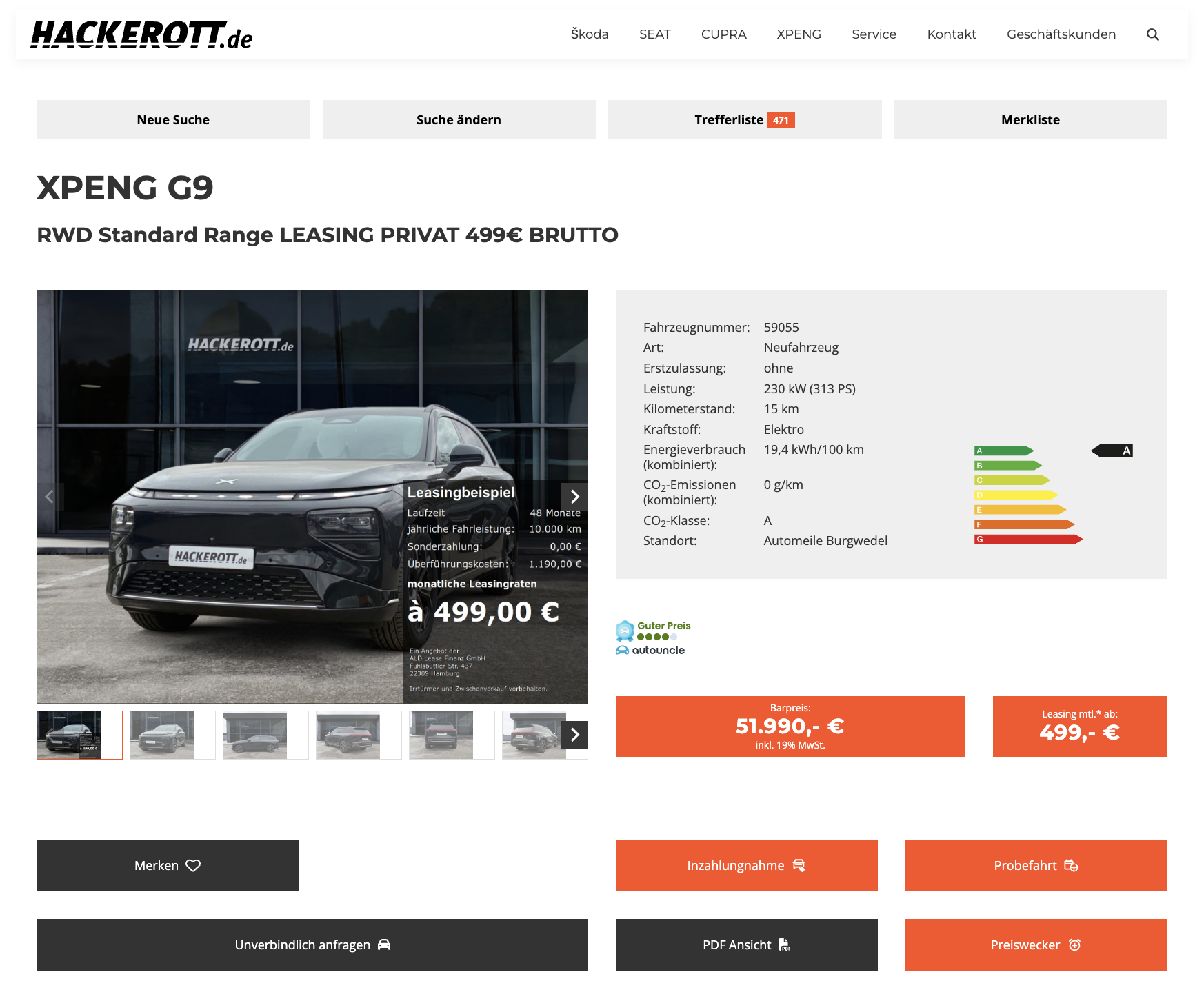 Der XPENG G9 ist ein großes Elektro-SUV, das viel Technik und ein hochwertiges Setup mitbringt. XPENG G9 RWD Standard Range bei Hackerott für 51.990 Euro brutto steht in Schwarz in einer umfangreichen Konfiguration bereit. Alternativ ist ein Leasing möglich, XPENG G9 RWD Standard Range für 499 Euro brutto pro Monat, ohne Sonderzahlung und mit 48 Monaten Laufzeit. Damit ist das Angebot sowohl für alle interessant, die direkt kaufen möchten, als auch für diejenigen, die lieber mit einer festen Monatsrate planen.