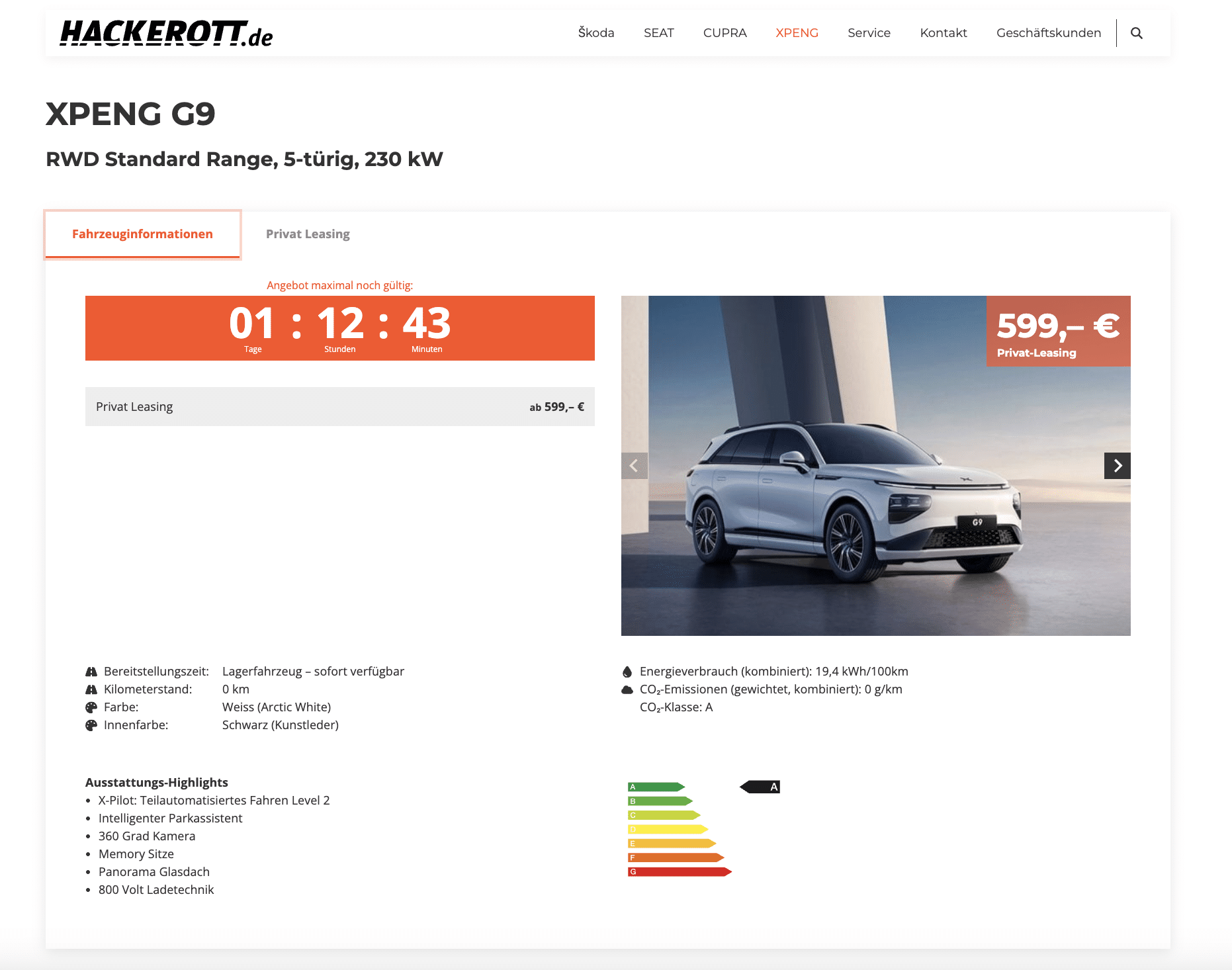 Wer sagt eigentlich, dass Premium-E-Mobilität immer aus Deutschland oder den USA kommen muss? Der XPENG G9 RWD Standard Range 230 kW zeigt, dass die Zukunft längst global ist und dass man mit einem SUV aus China in Sachen Style, Technik und Komfort auf Augenhöhe mit den Platzhirschen fährt. Bei Hackerott gibt es den Lifestyle-Stromer aktuell im Leasing für 599 Euro brutto im Monat, bei 48 Monaten Laufzeit und 10.000 Kilometern pro Jahr.